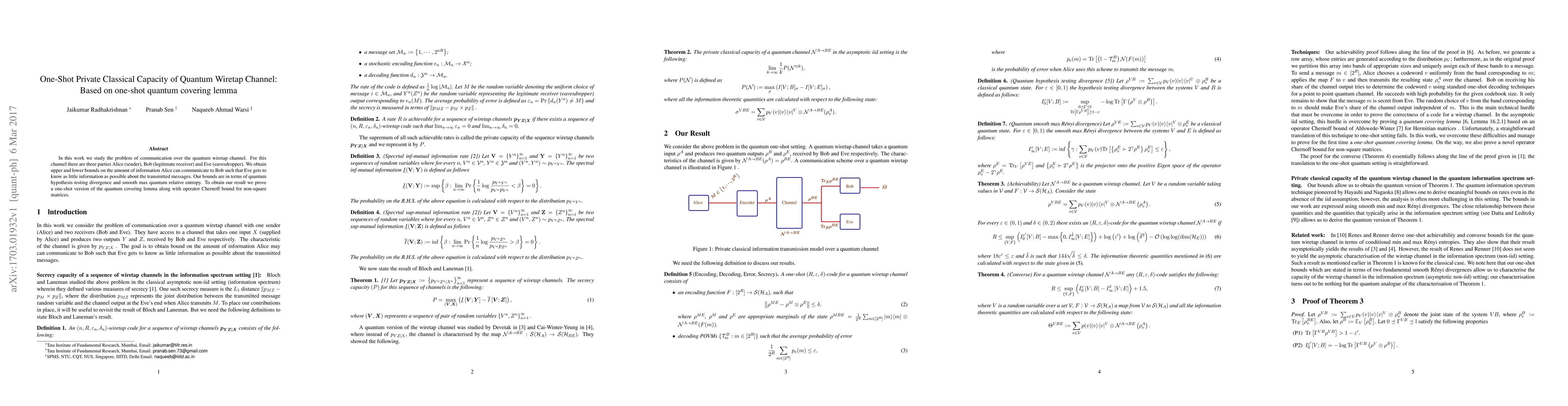 In this work we study the problem of communication over the quantum wiretap channel. For this channel there are three parties Alice (sender), Bob (legitimate receiver) and Eve (eavesdropper). We obtain upper and lower bounds on the amount of information Alice can communicate to Bob such that Eve gets to know as little information as possible about the transmitted messages. Our bounds are in terms of quantum hypothesis testing divergence and smooth max quantum relative entropy. To obtain our result we prove a one-shot version of the quantum covering lemma along with operator Chernoff bound for non-square matrices.