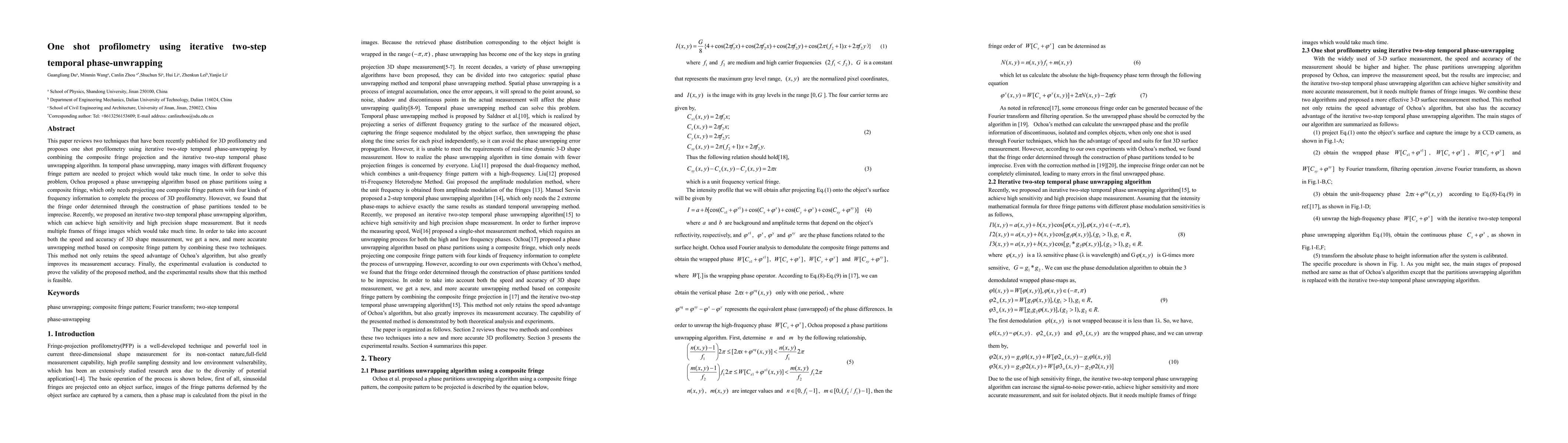 This paper proposes a one-shot profilometry method combining composite fringe projection and iterative two-step temporal phase unwrapping to achieve both speed and accuracy in 3D shape measurement. Experimental results demonstrate the effectiveness of the new method.