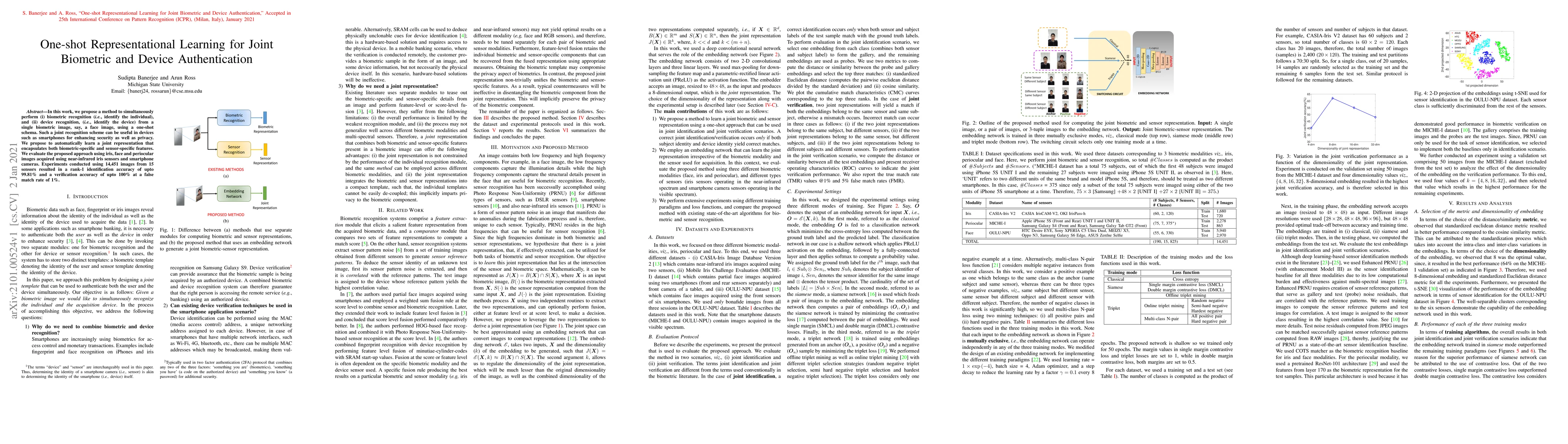 The paper proposes a one-shot method for simultaneous user and device authentication from a single biometric image using a joint representation learned by an embedding network. The method is evaluated across three biometric modalities (iris, face, and periocular) and various sensors (near-infrared iris sensors and smartphone cameras).