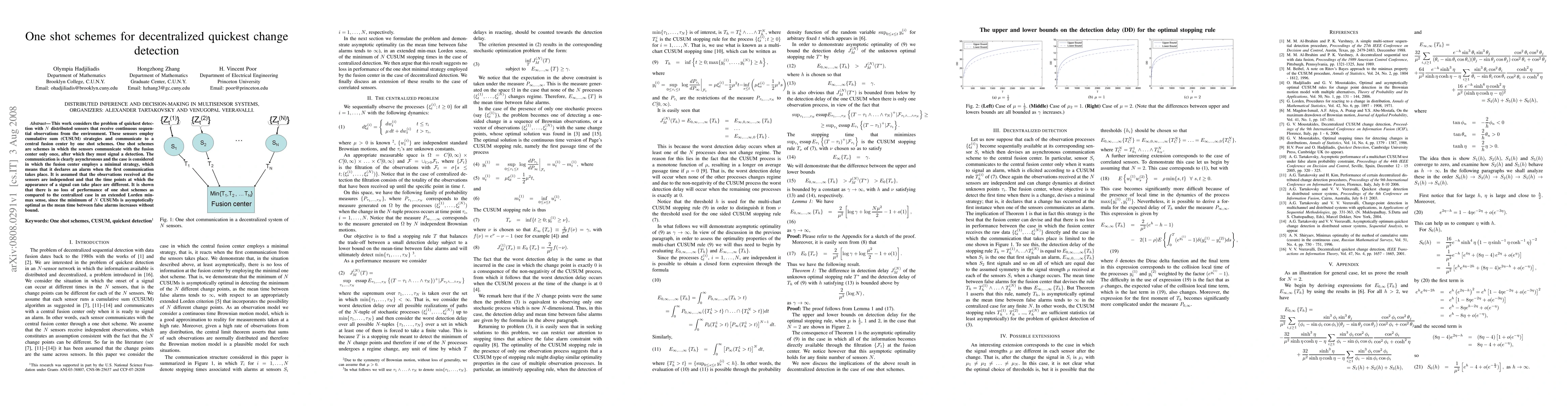 This work considers the problem of quickest detection with N distributed sensors that receive continuous sequential observations from the environment. These sensors employ cumulative sum (CUSUM) strategies and communicate to a central fusion center by one shot schemes. One shot schemes are schemes in which the sensors communicate with the fusion center only once, after which they must signal a detection. The communication is clearly asynchronous and the case is considered in which the fusion center employs a minimal strategy, which means that it declares an alarm when the first communication takes place. It is assumed that the observations received at the sensors are independent and that the time points at which the appearance of a signal can take place are different. It is shown that there is no loss of performance of one shot schemes as compared to the centralized case in an extended Lorden min-max sense, since the minimum of N CUSUMs is asymptotically optimal as the mean time between false alarms increases without bound.