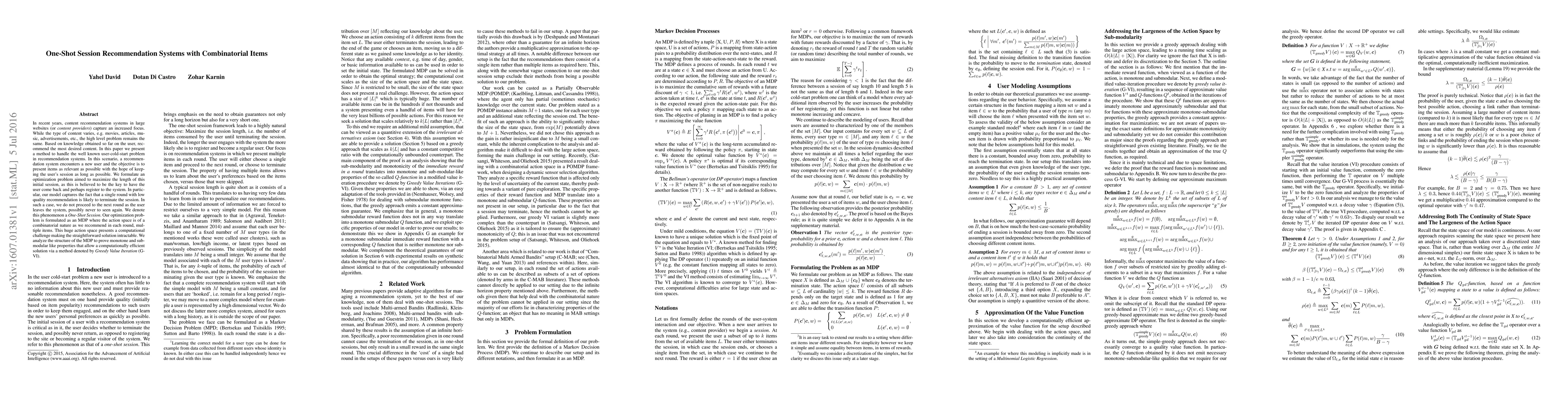 In recent years, content recommendation systems in large websites (or \emph{content providers}) capture an increased focus. While the type of content varies, e.g.\ movies, articles, music, advertisements, etc., the high level problem remains the same. Based on knowledge obtained so far on the user, recommend the most desired content. In this paper we present a method to handle the well known user-cold-start problem in recommendation systems. In this scenario, a recommendation system encounters a new user and the objective is to present items as relevant as possible with the hope of keeping the user's session as long as possible. We formulate an optimization problem aimed to maximize the length of this initial session, as this is believed to be the key to have the user come back and perhaps register to the system. In particular, our model captures the fact that a single round with low quality recommendation is likely to terminate the session. In such a case, we do not proceed to the next round as the user leaves the system, possibly never to seen again. We denote this phenomenon a \emph{One-Shot Session}. Our optimization problem is formulated as an MDP where the action space is of a combinatorial nature as we recommend in each round, multiple items. This huge action space presents a computational challenge making the straightforward solution intractable. We analyze the structure of the MDP to prove monotone and submodular like properties that allow a computationally efficient solution via a method denoted by \emph{Greedy Value Iteration} (G-VI).