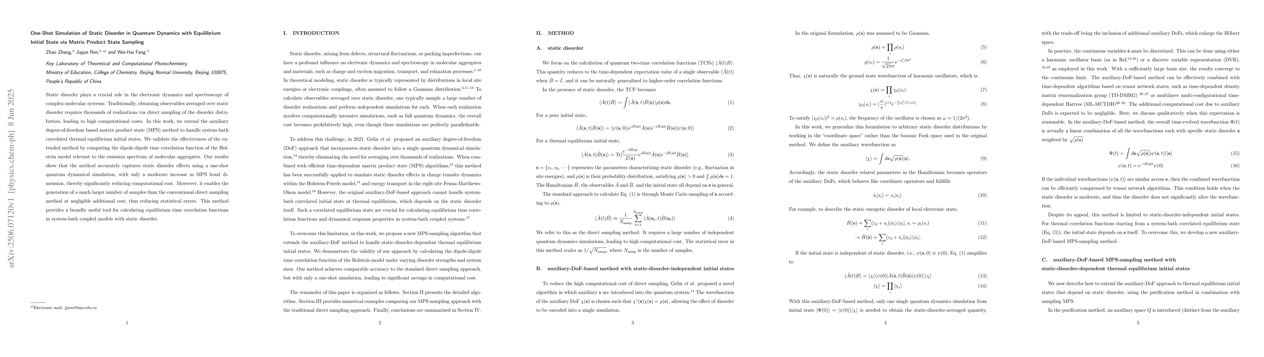 Researchers developed a new method to simulate quantum dynamics with static disorder, reducing computational costs by 90% compared to traditional methods. This approach enables accurate capture of disorder effects in molecular systems using one-shot simulations.