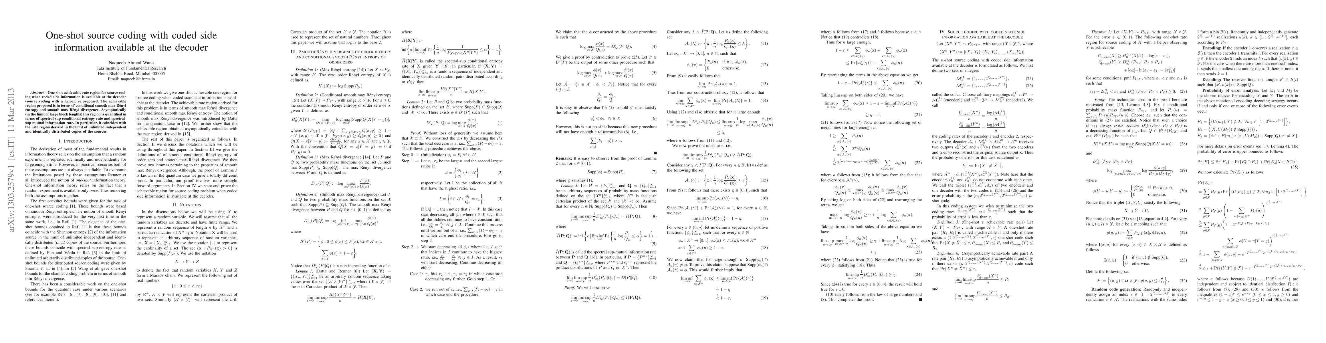 One-shot achievable rate region for source coding when coded side information is available at the decoder (source coding with a helper) is proposed. The achievable region proposed is in terms of conditional smooth max Renyi entropy and smooth max Renyi divergence. Asymptotically (in the limit of large block lengths) this region is quantified in terms of spectral-sup conditional entropy rate and spectral- sup mutual information rate. In particular, it coincides with the rate region derived in the limit of unlimited independent and identically distributed copies of the sources.