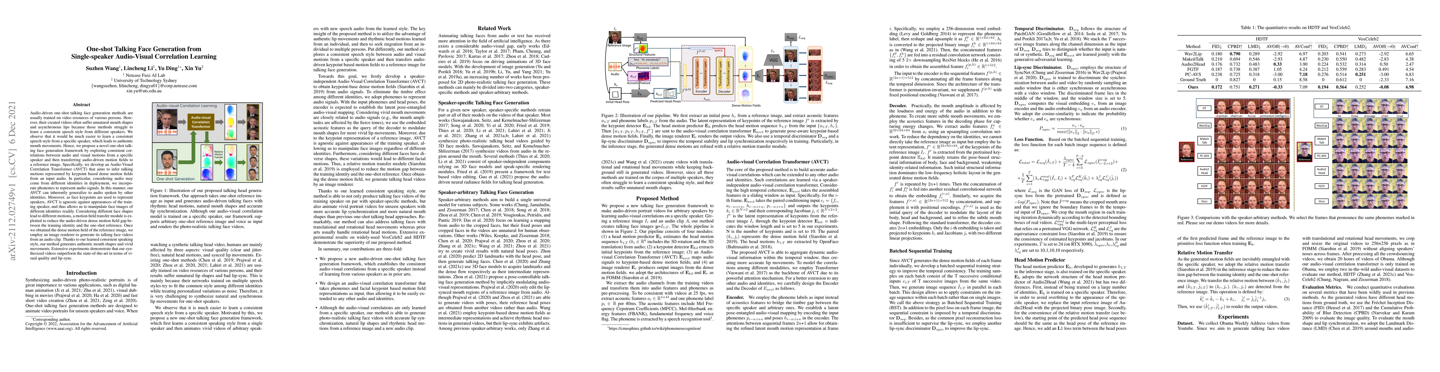 This paper proposes a novel one-shot talking face generation framework using Audio-Visual Correlation Transformer (AVCT) to learn consistent speech styles from a specific speaker, generating authentic mouth movements and lip-sync. The method leverages phonemes and a motion field transfer module to generalize to different identities and shapes, resulting in high-quality synthesized talking face videos.