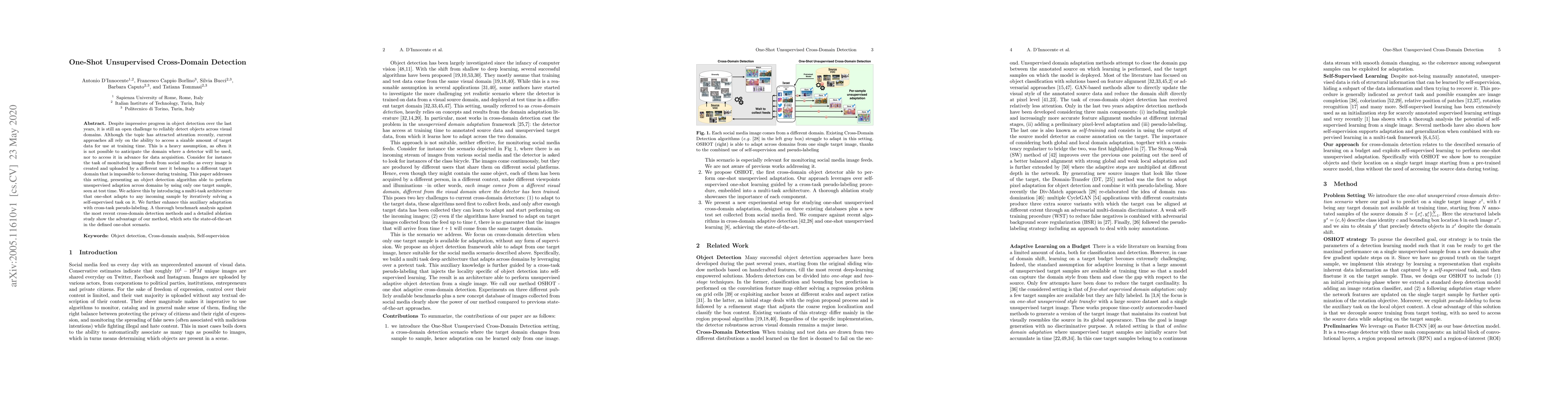 Despite impressive progress in object detection over the last years, it is still an open challenge to reliably detect objects across visual domains. Although the topic has attracted attention recently, current approaches all rely on the ability to access a sizable amount of target data for use at training time. This is a heavy assumption, as often it is not possible to anticipate the domain where a detector will be used, nor to access it in advance for data acquisition. Consider for instance the task of monitoring image feeds from social media: as every image is created and uploaded by a different user it belongs to a different target domain that is impossible to foresee during training. This paper addresses this setting, presenting an object detection algorithm able to perform unsupervised adaption across domains by using only one target sample, seen at test time. We achieve this by introducing a multi-task architecture that one-shot adapts to any incoming sample by iteratively solving a self-supervised task on it. We further enhance this auxiliary adaptation with cross-task pseudo-labeling. A thorough benchmark analysis against the most recent cross-domain detection methods and a detailed ablation study show the advantage of our method, which sets the state-of-the-art in the defined one-shot scenario.