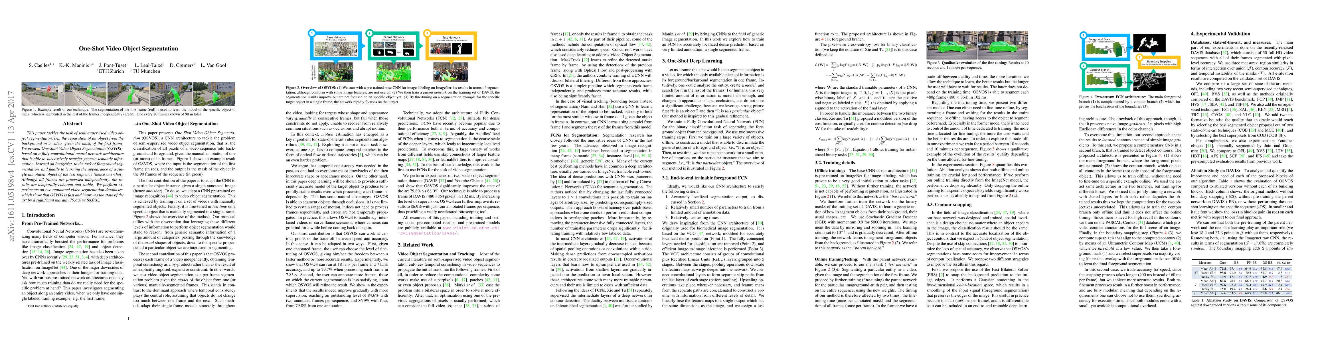 This paper introduces One-Shot Video Object Segmentation (OSVOS), a semi-supervised method for video object segmentation using a fully-convolutional neural network that leverages ImageNet pre-training and processes each frame independently while maintaining temporal coherence, achieving state-of-the-art results.