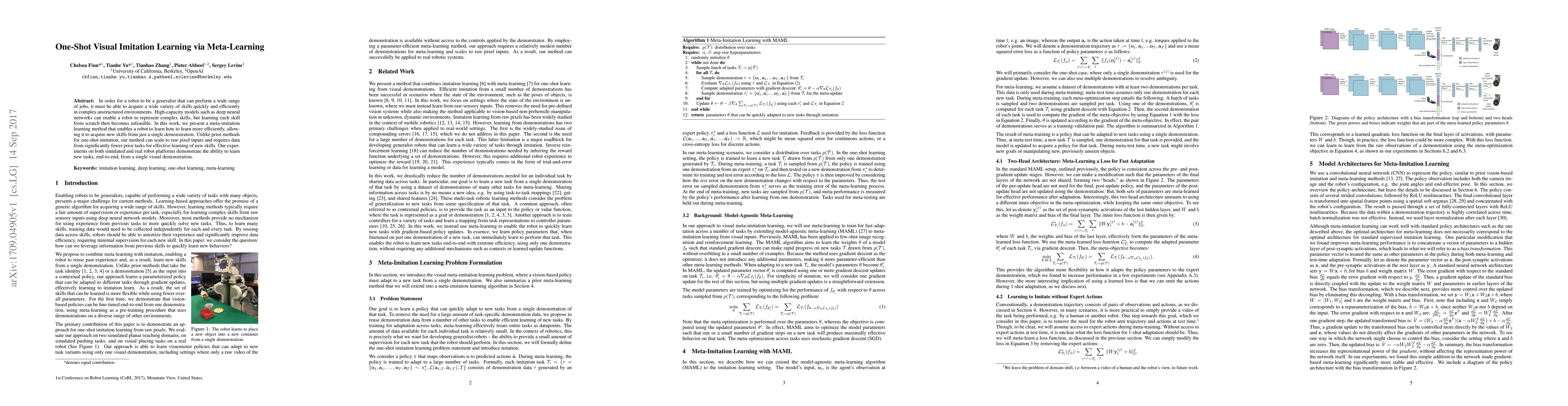 This paper introduces a meta-imitation learning method for robots to efficiently acquire new skills from just one demonstration, scaling to raw pixel inputs and requiring fewer prior tasks. Experiments show successful end-to-end learning of new tasks from a single visual demonstration on both simulated and real platforms.