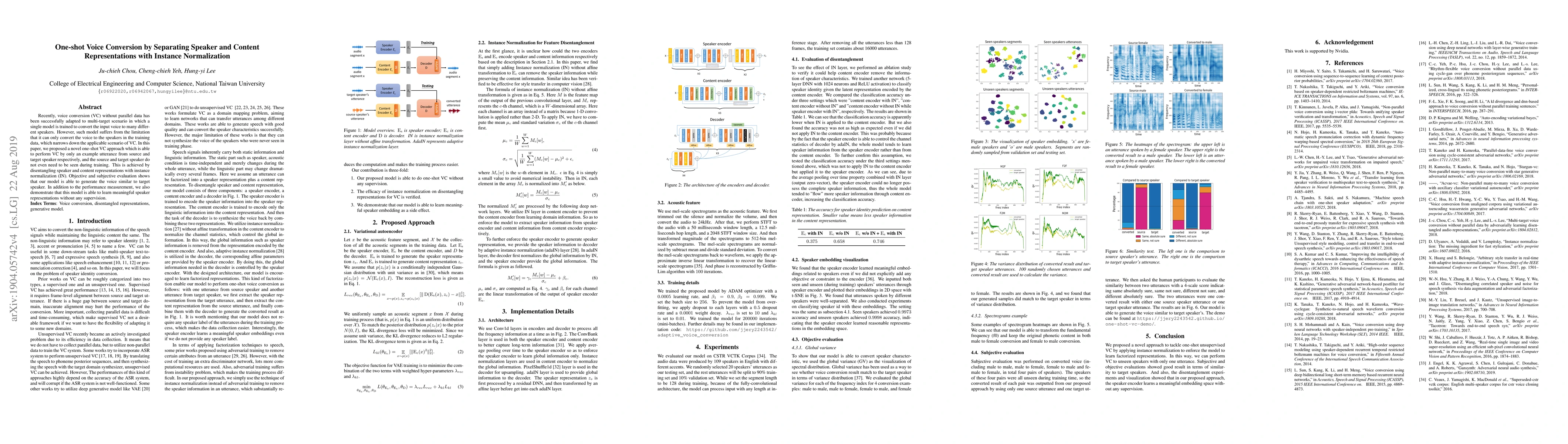 This paper proposes a novel one-shot voice conversion method that can convert a voice to a new target speaker using only a single example from both source and target speakers. The approach disentangles speaker and content representations using instance normalization, enabling effective voice conversion without parallel data and demonstrating both objective and subjective performance.