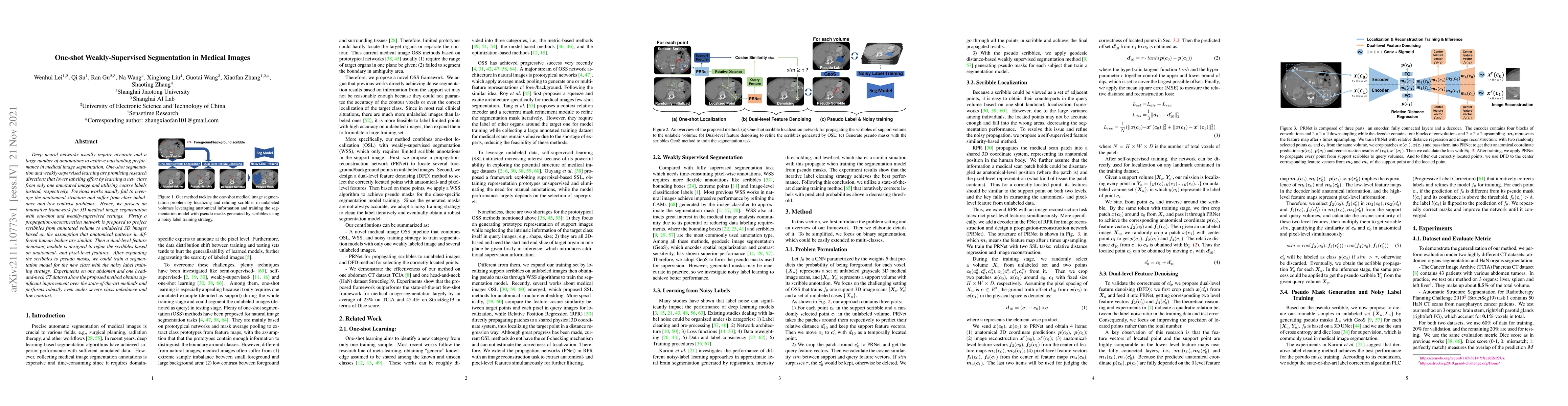 This paper introduces a novel framework for one-shot, weakly-supervised 3D medical image segmentation, utilizing a propagation-reconstruction network and a dual-level feature denoising module to refine annotations from a single labeled image, achieving significant improvements over existing methods. The approach demonstrates robustness against class imbalance and low contrast in abdominal and head-and-neck CT datasets.
