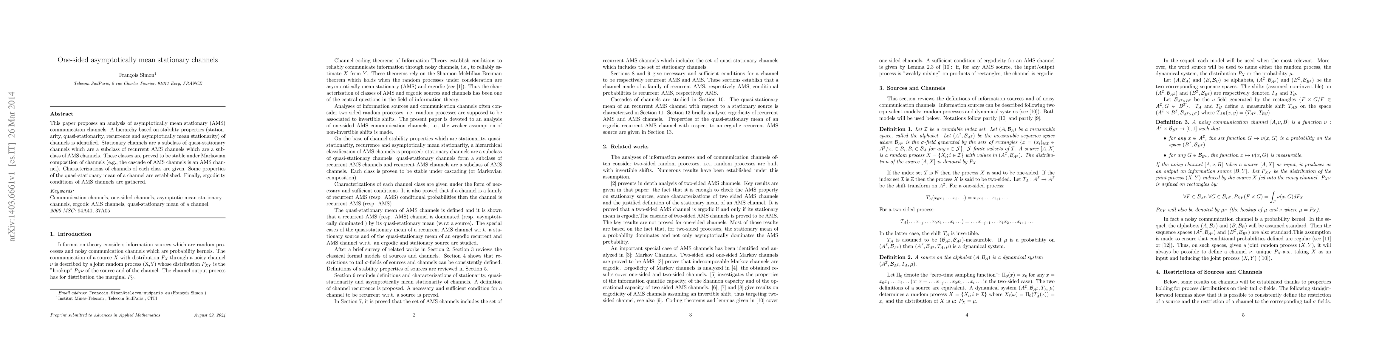 This paper analyzes asymptotically mean stationary (AMS) communication channels, establishing a hierarchy based on stability properties, and proves that AMS channels remain stable under Markovian composition. It also characterizes each class and explores quasi-stationary mean properties and ergodicity conditions.