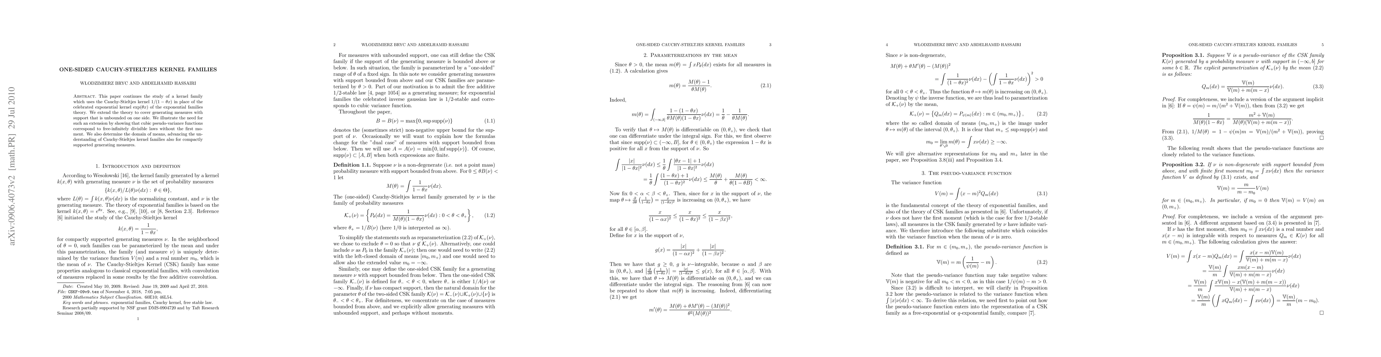 This paper continues the study of a kernel family which uses the Cauchy-Stieltjes kernel in place of the celebrated exponential kernel of the exponential families theory. We extend the theory to cover generating measures with support that is unbounded on one side. We illustrate the need for such an extension by showing that cubic pseudo-variance functions correspond to free-infinitely divisible laws without the first moment. We also determine the domain of means, advancing the understanding of Cauchy-Stieltjes kernel families also for compactly supported generating measures.