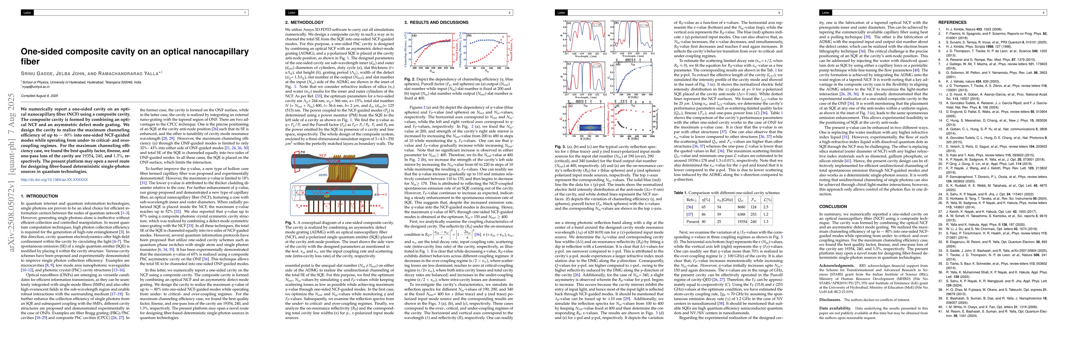 We numerically report a one-sided cavity on an optical nanocapillary fiber (NCF) using a composite cavity. The composite cavity is formed by combining an optical NCF and an asymmetric defect mode grating. We design the cavity to realize the maximum channeling efficiency of up to 80% into one-sided NCF-guided modes while operating from under- to critical- and overcoupling regimes. For the maximum channeling efficiency case, we found the best quality factor, finesse, and one-pass loss of the cavity are 19354, 240, and 1.3%, respectively. The present platform may open a novel route for designing fiber-based deterministic single-photon sources in quantum technologies.