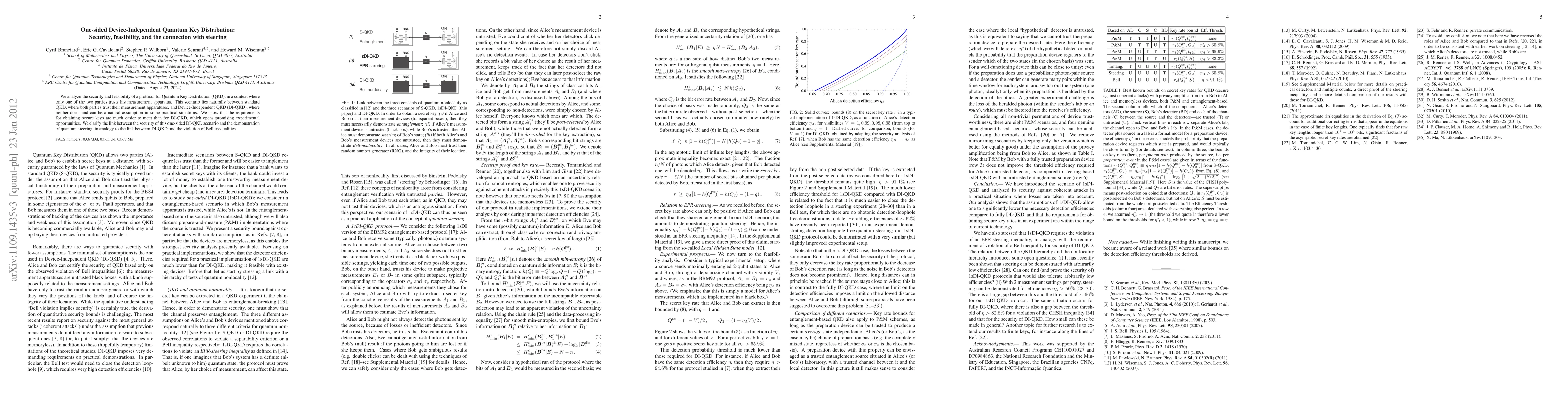This paper examines a one-sided Device-Independent Quantum Key Distribution (QKD) protocol, where only one party trusts their measurement apparatus, finding it more feasible than full Device-Independent QKD. The study also establishes a connection between the security of this protocol and the demonstration of quantum steering.