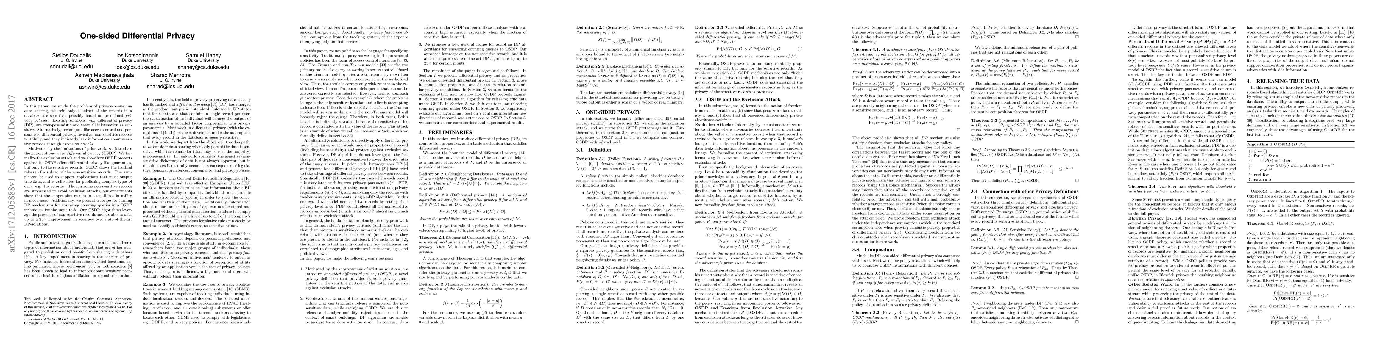This paper introduces one-sided differential privacy (OSDP) to address privacy-preserving data sharing for sensitive records, allowing truthful release of non-sensitive records. OSDP offers differential privacy guarantees only for sensitive records, improving accuracy by up to 25x compared to traditional differential privacy methods.