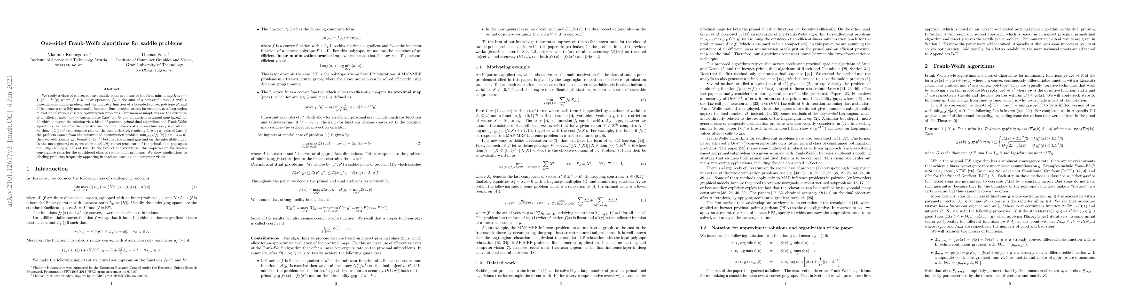 This paper explores one-sided Frank-Wolfe algorithms for solving convex-concave saddle-point problems, achieving improved convergence rates for specific cases. The study leverages linear minimization oracles and efficient proximal maps to enhance solution efficiency, with notable applications in machine learning and computer vision.