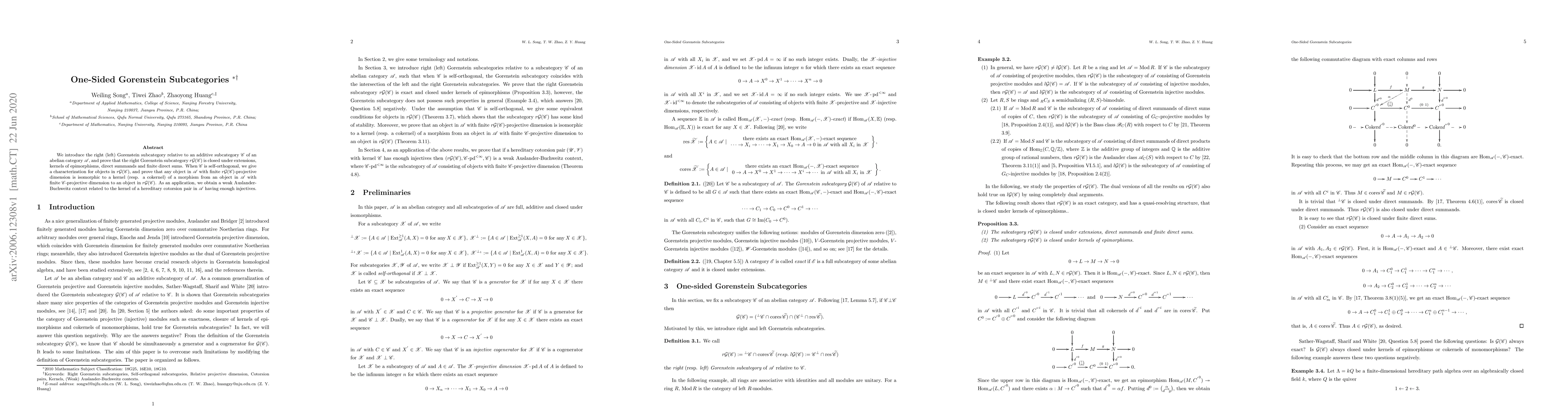 We introduce the right (left) Gorenstein subcategory relative to an additive subcategory $\C$ of an abelian category $\A$, and prove that the right Gorenstein subcategory $r\mathcal{G}(\mathscr{C})$ is closed under extensions, kernels of epimorphisms, direct summands and finite direct sums. When $\C$ is self-orthogonal, we give a characterization for objects in $r\mathcal{G}(\mathscr{C})$, and prove that any object in $\A$ with finite $r\mathcal{G}(\C)$-projective dimension is isomorphic to a kernel (resp. a cokernel) of a morphism from an object in $\A$ with finite $\C$-projective dimension to an object in $r\mathcal{G}(\C)$. As an application, we obtain a weak Auslander-Buchweitz context related to the kernel of a hereditary cotorsion pair in $\A$ having enough injectives.