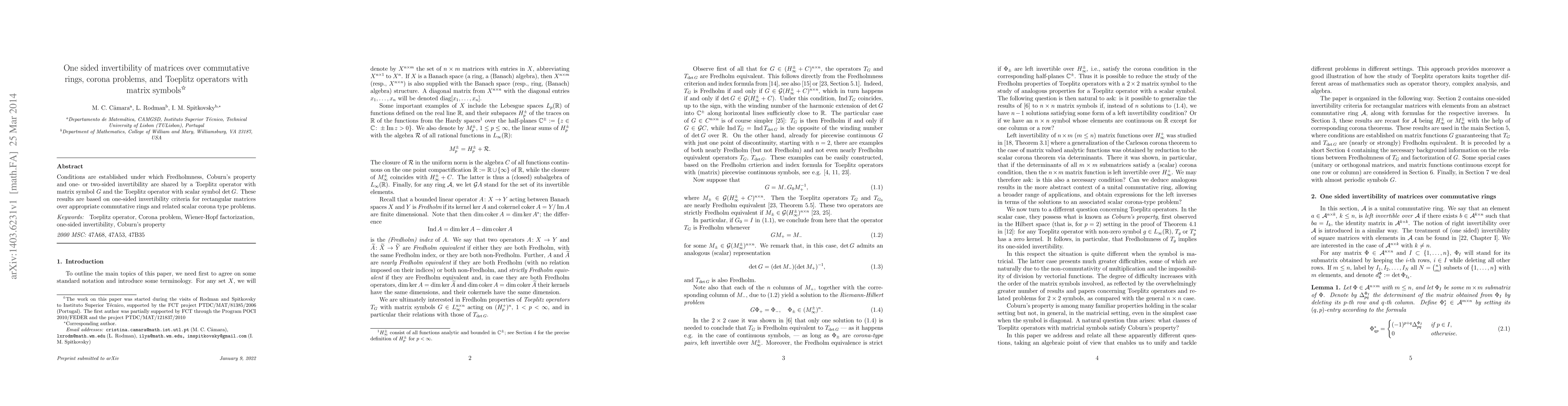 Conditions are established under which Fredholmness, Coburn's property and one- or two-sided invertibility are shared by a Toeplitz operator with matrix symbol $G$ and the Toeplitz operator with scalar symbol $\det G$. These results are based on one-sided invertibility criteria for rectangular matrices over appropriate commutative rings and related scalar corona type problems.