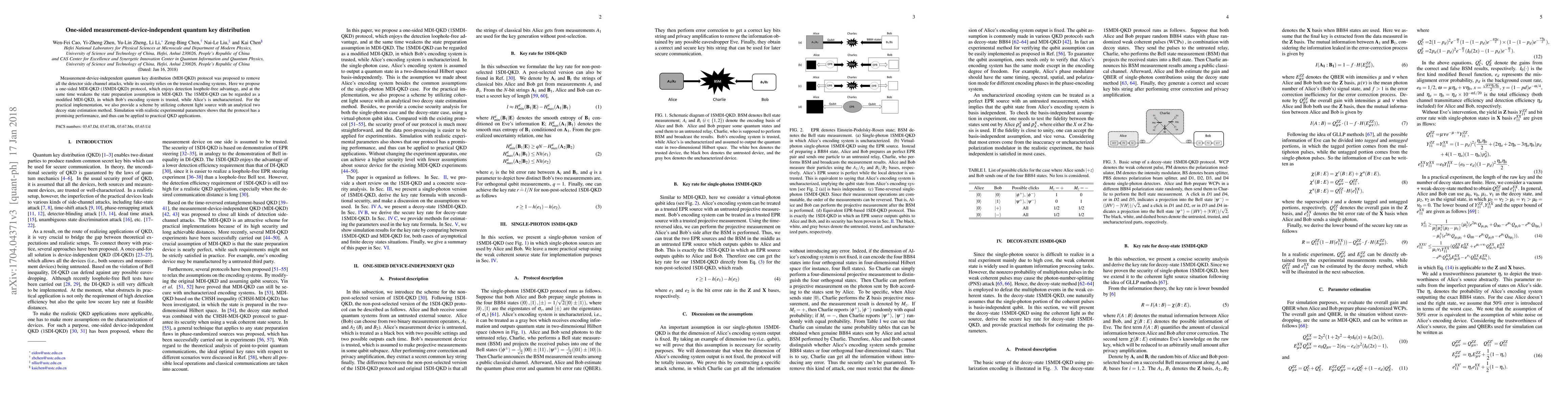 This paper proposes a one-sided measurement-device-independent quantum key distribution (1SMDI-QKD) protocol that eliminates the detection loophole and reduces the reliance on trusted state preparation systems. The protocol is practical and demonstrated to perform well with a coherent light source and decoy state estimation method.