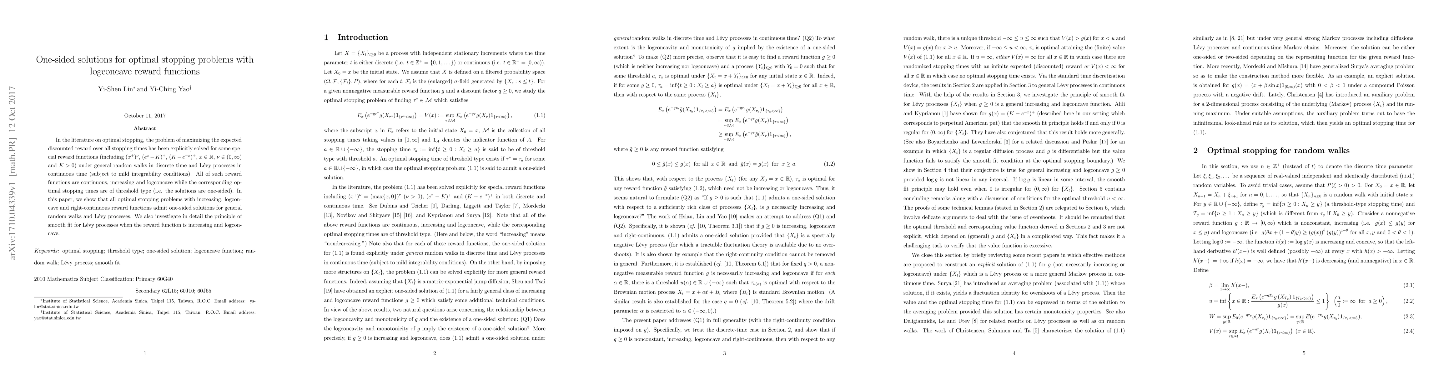 In the literature on optimal stopping, the problem of maximizing the expected discounted reward over all stopping times has been explicitly solved for some special reward functions (including $(x^+)^{\nu}$, $(e^x-K)^+$, $(K-e^{-x})^+$, $x\in\mathbb{R}$, $\nu\in(0,\infty)$ and $K>0$) under general random walks in discrete time and L\'evy processes in continuous time (subject to mild integrability conditions). All of such reward functions are continuous, increasing and logconcave while the corresponding optimal stopping times are of threshold type (i.e. the solutions are one-sided). In this paper, we show that all optimal stopping problems with increasing, logconcave and right-continuous reward functions admit one-sided solutions for general random walks and L\'evy processes. We also investigate in detail the principle of smooth fit for L\'evy processes when the reward function is increasing and logconcave.