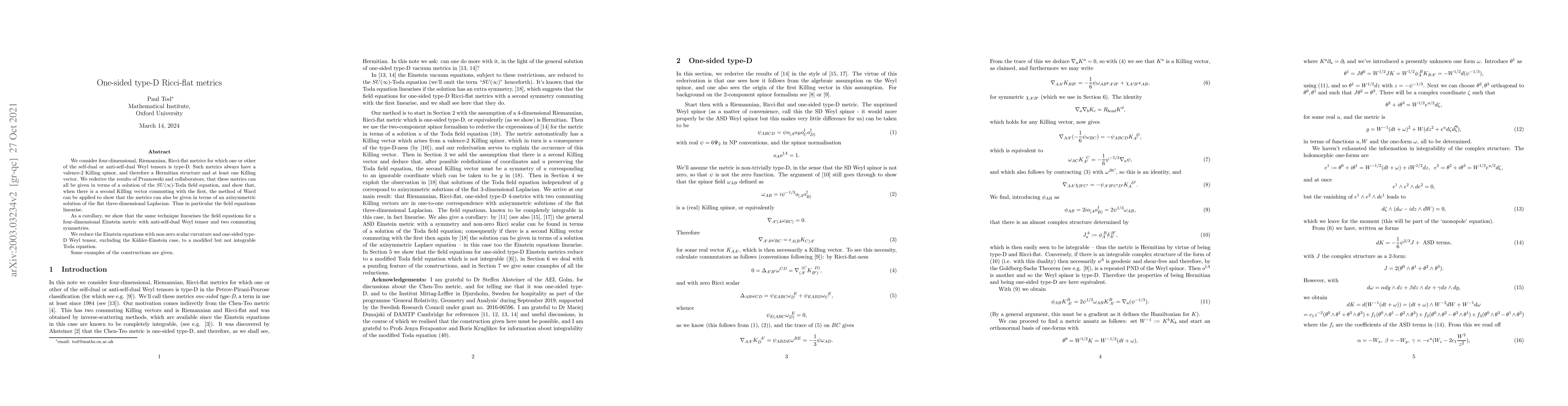 We consider four-dimensional, Riemannian, Ricci-flat metrics for which one or other of the self-dual or anti-self-dual Weyl tensors is type-D. Such metrics always have a valence-2 Killing spinor, and therefore a Hermitian structure and at least one Killing vector. We rederive the results of Przanowski and collaborators, that these metrics can all be given in terms of a solution of the $SU(\infty)$-Toda field equation, and show that, when there is a second Killing vector commuting with the first, the method of Ward can be applied to show that the metrics can also be given in terms of an axisymmetric solution of the flat three-dimensional Laplacian. Thus in particular the field equations linearise. As a corollary, we show that the same technique linearises the field equations for a four-dimensional Einstein metric with anti-self-dual Weyl tensor and two commuting symmetries. We reduce the Einstein equations with non-zero scalar curvature and one-sided type-D Weyl tensor, excluding the K\"ahler-Einstein case, to a modified but not integrable Toda equation. Some examples of the constructions are given.