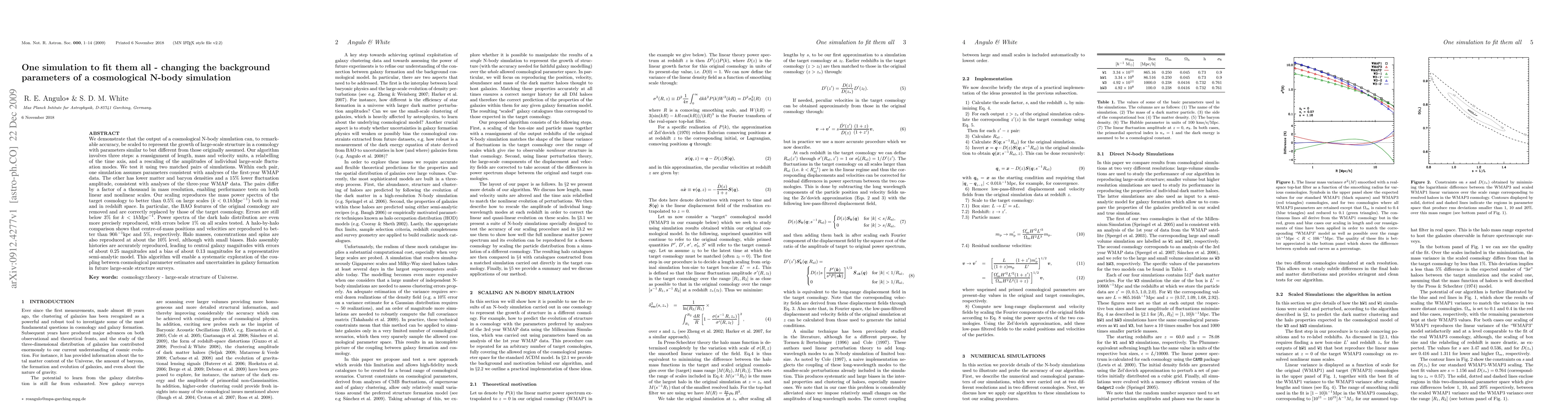 We demonstrate that the output of a cosmological N-body simulation can, to remarkable accuracy, be scaled to represent the growth of large-scale structure in a cosmology with parameters similar to but different from those originally assumed. Our algorithm involves three steps: a reassignment of length, mass and velocity units, a relabelling of the time axis, and a rescaling of the amplitudes of individual large-scale fluctuation modes. We test it using two matched pairs of simulations. Within each pair, one simulation assumes parameters consistent with analyses of the first-year WMAP data. The other has lower matter and baryon densities and a 15% lower fluctuation amplitude, consistent with analyses of the three-year WMAP data. The pairs differ by a factor of a thousand in mass resolution, enabling performance tests on both linear and nonlinear scales. Our scaling reproduces the mass power spectra of the target cosmology to better than 0.5% on large scales (k < 0.1 h/Mpc) both in real and in redshift space. In particular, the BAO features of the original cosmology are removed and are correctly replaced by those of the target cosmology. Errors are still below 3% for k < 1 h/Mpc. Power spectra of the dark halo distribution are even more precisely reproduced, with errors below 1% on all scales tested. A halo-by-halo comparison shows that centre-of-mass positions and velocities are reproduced to better than 90 kpc/h and 5%, respectively. Halo masses, concentrations and spins are also reproduced at about the 10% level, although with small biases. Halo assembly histories are accurately reproduced, leading to central galaxy magnitudes with errors of about 0.25 magnitudes and a bias of about 0.13 magnitudes for a representative semi-analytic model.