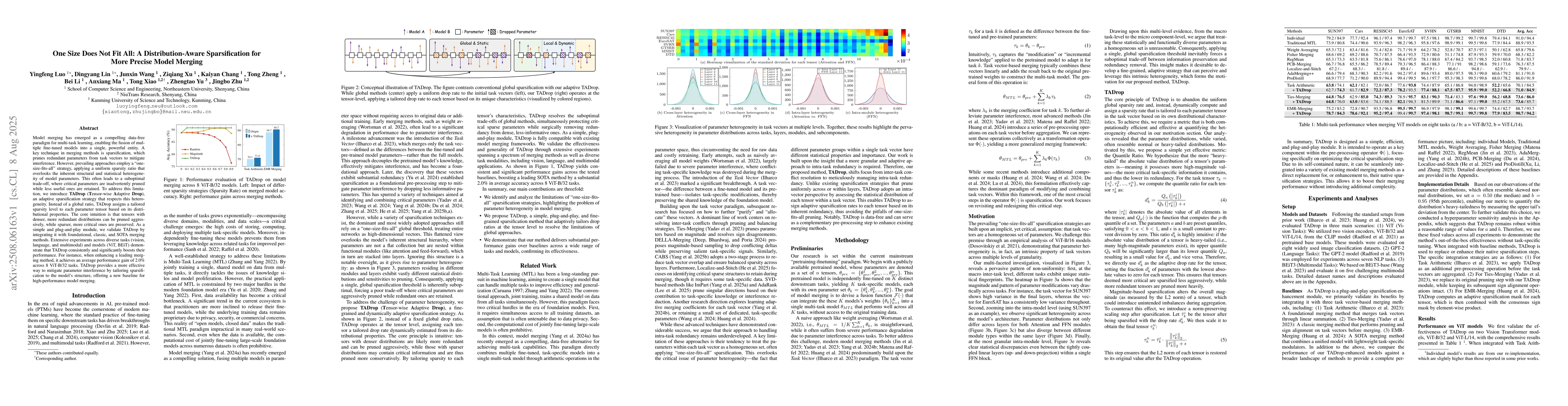 The research introduces TADrop, an adaptive sparsification strategy for model merging that assigns tailored sparsity levels to each parameter tensor based on its distributional properties, unlike previous methods that use a uniform sparsity ratio.
