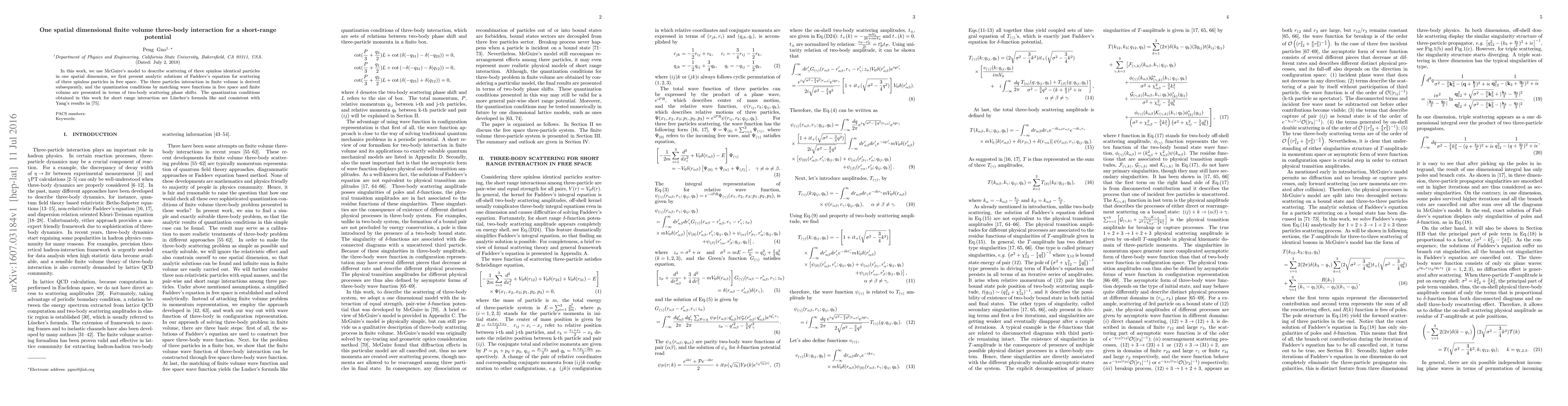 This paper utilizes McGuire's model to analytically solve Faddeev's equation for scattering of three spinless identical particles in one dimension. It derives the three-body interaction in finite volume and presents quantization conditions matching wave functions, yielding results consistent with L\"uscher's formula and Yang's findings for short-range potentials.