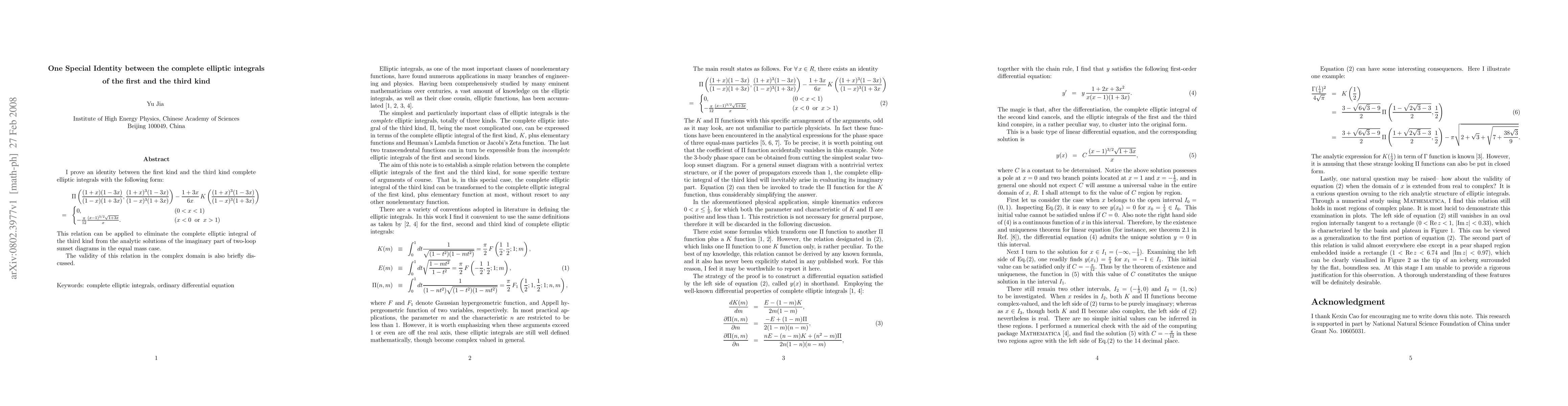 This paper establishes an identity relating the first and third kind complete elliptic integrals, which simplifies analytic solutions for the imaginary part of two-loop sunset diagrams in the equal mass case. The identity's validity in the complex domain is briefly examined.