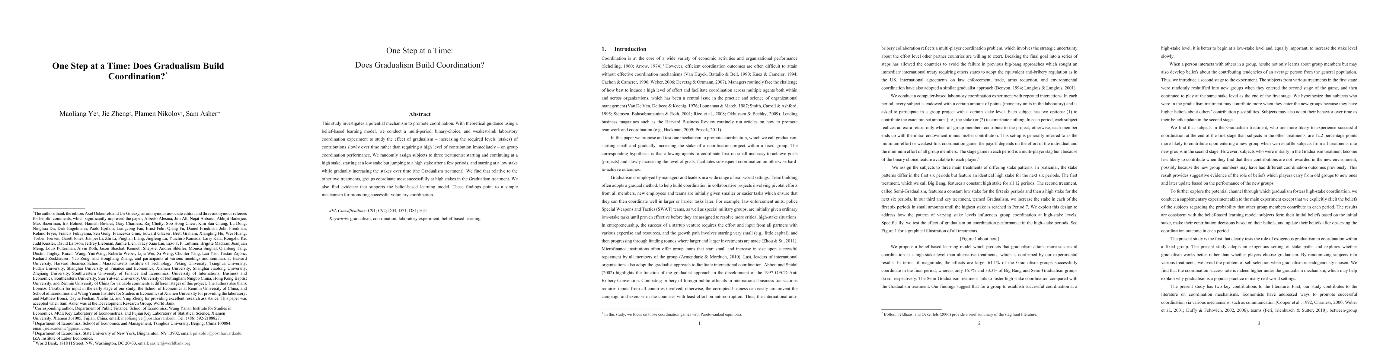 This study investigates a potential mechanism to promote coordination. With theoretical guidance using a belief-based learning model, we conduct a multi-period, binary-choice, and weakest-link laboratory coordination experiment to study the effect of gradualism - increasing the required levels (stakes) of contributions slowly over time rather than requiring a high level of contribution immediately - on group coordination performance. We randomly assign subjects to three treatments: starting and continuing at a high stake, starting at a low stake but jumping to a high stake after a few periods, and starting at a low stake while gradually increasing the stakes over time (the Gradualism treatment). We find that relative to the other two treatments, groups coordinate most successfully at high stakes in the Gradualism treatment. We also find evidence that supports the belief-based learning model. These findings point to a simple mechanism for promoting successful voluntary coordination.