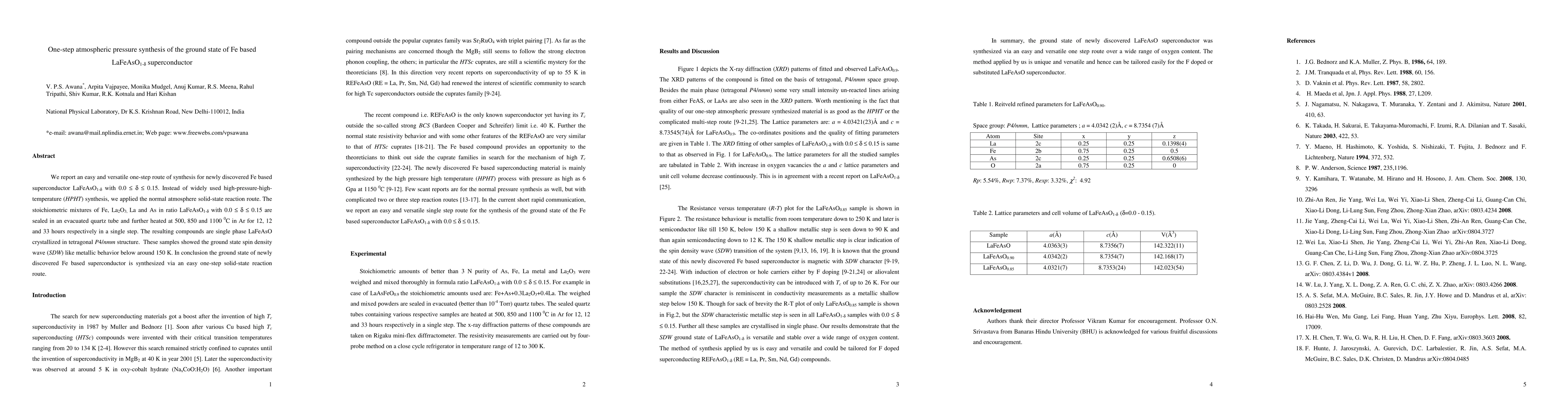 We report an easy and versatile one-step route of synthesis for newly discovered Fe based superconductor LaFeAsO1-d with d = 0.0 to 0.15. Instead of widely used high-pressure-high-temperature (HPHT) synthesis, we applied the normal atmosphere solid-state reaction route. The stoichiometric mixtures of Fe, La2O3, La and As in ratio LaFeAsO1-d with d = 0.0 to 0.15 are sealed in an evacuated quartz tube and further heated at 500, 850 and 1100 0C in Ar for 12, 12 and 33 hours respectively in a single step. The resulting compounds are single phase LaFeAsO crystallized in tetragonal P4/nmm structure. These samples showed the ground state spin density wave (SDW) like metallic behavior below around 150 K. In conclusion the ground state of newly discovered Fe based superconductor is synthesized via an easy one-step solid-state reaction route.