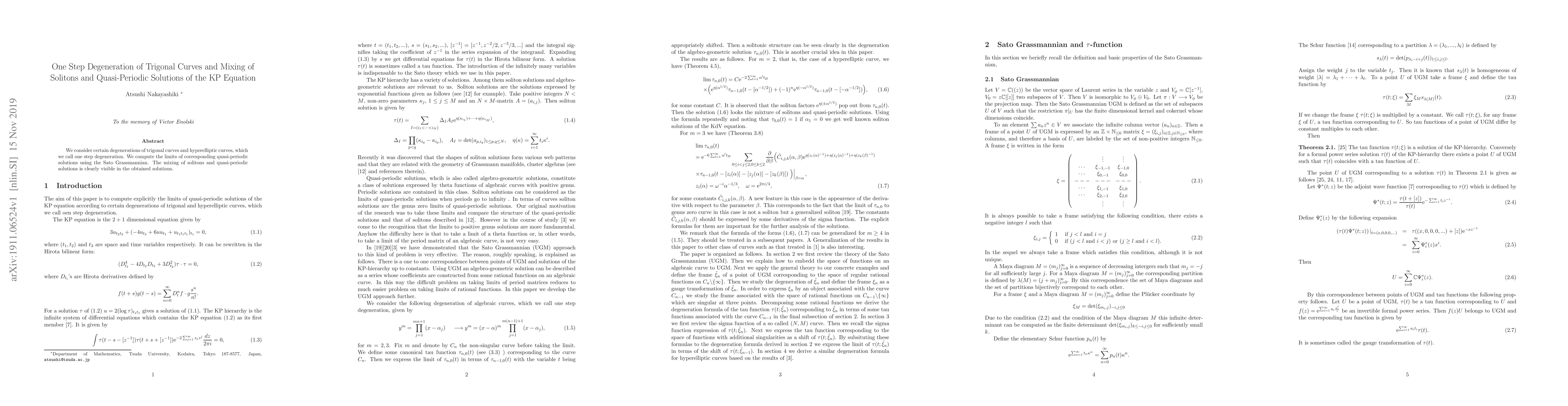 Summary: This paper examines one step degenerations of trigonal and hyperelliptic curves, calculating limits of quasi-periodic solutions via the Sato Grassmannian, revealing the interplay between solitons and quasi-periodic solutions in the resulting structures.