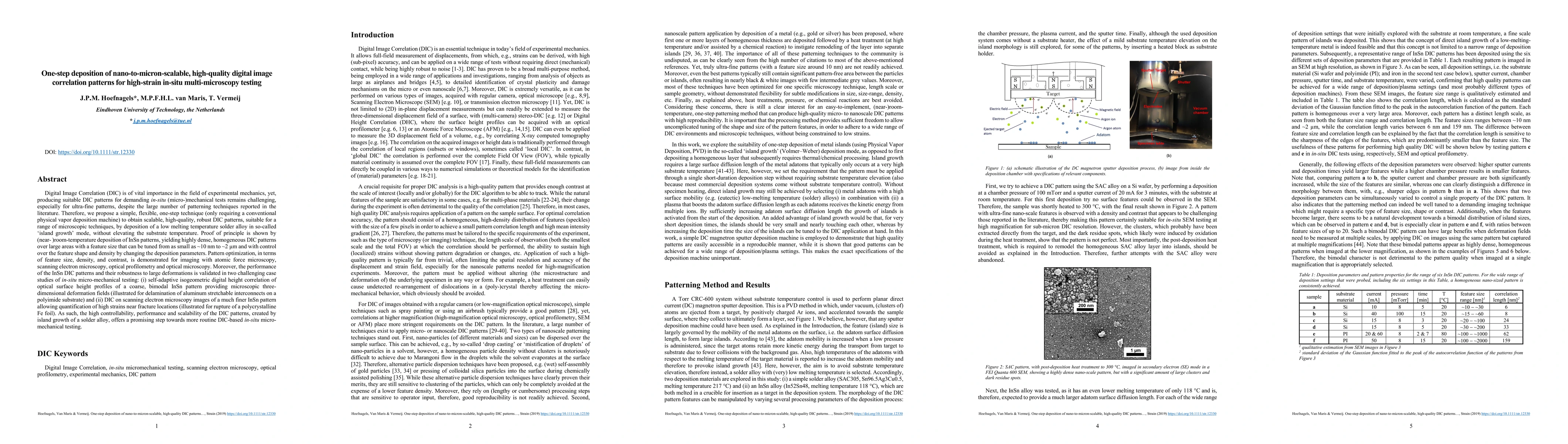 This paper proposes a one-step, scalable technique for depositing high-quality, nano-to-micron-sized Digital Image Correlation patterns using low melting temperature solder alloy deposition. The method enables precise control over pattern features, demonstrating robust performance in high-strain in-situ microscopy tests, including atomic force microscopy and SEM imaging.