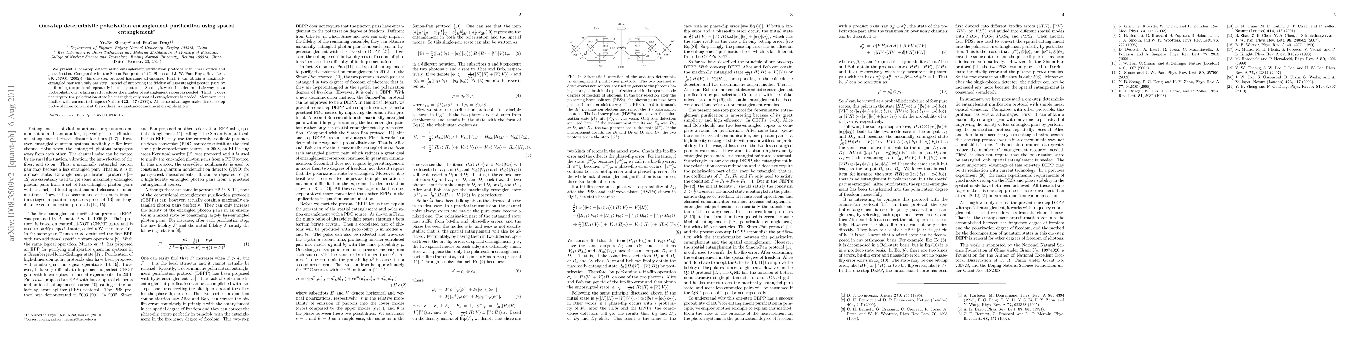 This paper introduces a one-step deterministic entanglement purification protocol utilizing spatial entanglement, offering a maximally entangled pair in a single step, unlike probabilistic methods, and requiring only spatial, not polarization, entanglement. It is advantageous for quantum communication applications.