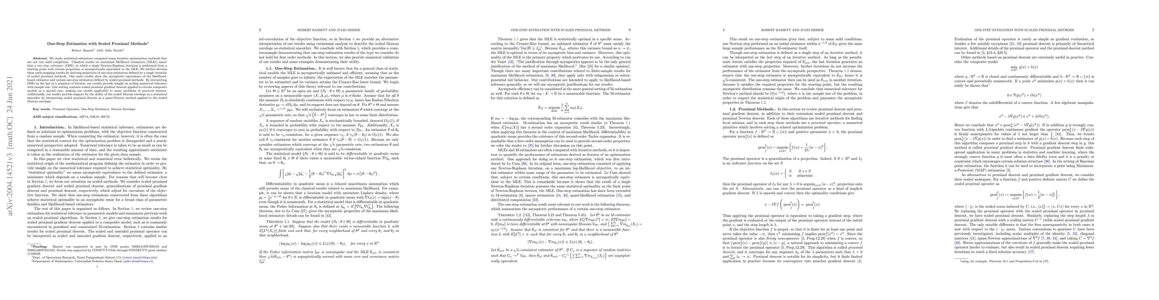 Researchers prove that certain statistical estimators, called one-step estimators, have the same asymptotic behavior as maximum likelihood estimators when using specific optimization methods. This finding has implications for problems in various fields where scaled proximal gradient descent is applied.