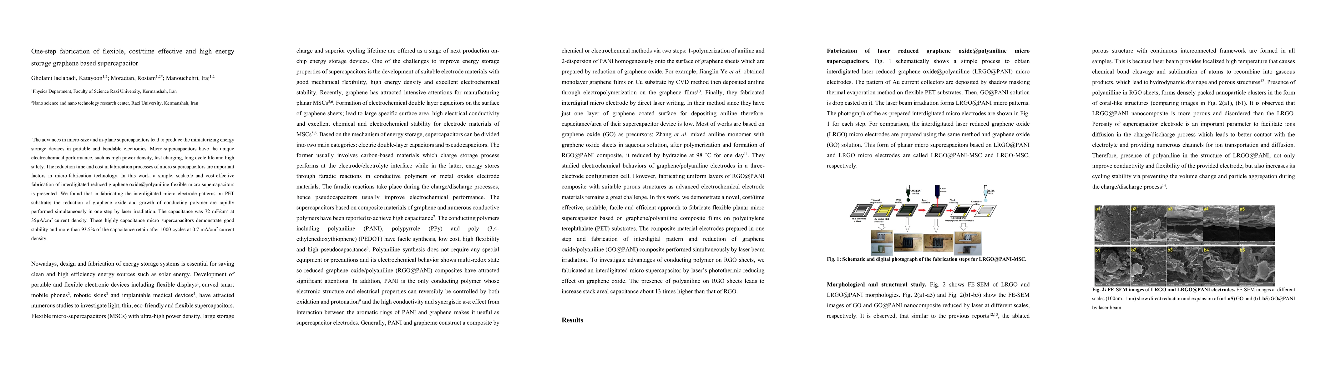 This paper presents a one-step fabrication method for flexible, cost-effective, and high-energy graphene-based supercapacitors using laser irradiation for simultaneous reduction of graphene oxide and growth of polyaniline. The resulting micro-supercapacitors exhibit high capacitance, stability, and retain over 93.5% of their initial capacitance after 1000 cycles.