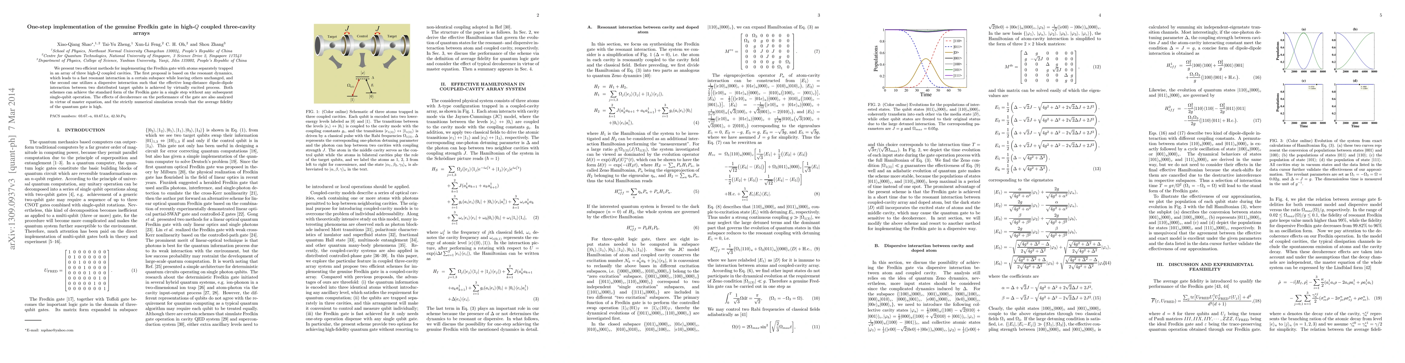 This paper proposes two efficient methods for implementing the Fredkin gate using atoms trapped in high-$Q$ coupled three-cavity arrays, achieving the gate in a single step without additional single-qubit operations. Both methods—one based on resonant dynamics and the other on dispersive interaction—show high average fidelity despite decoherence effects.