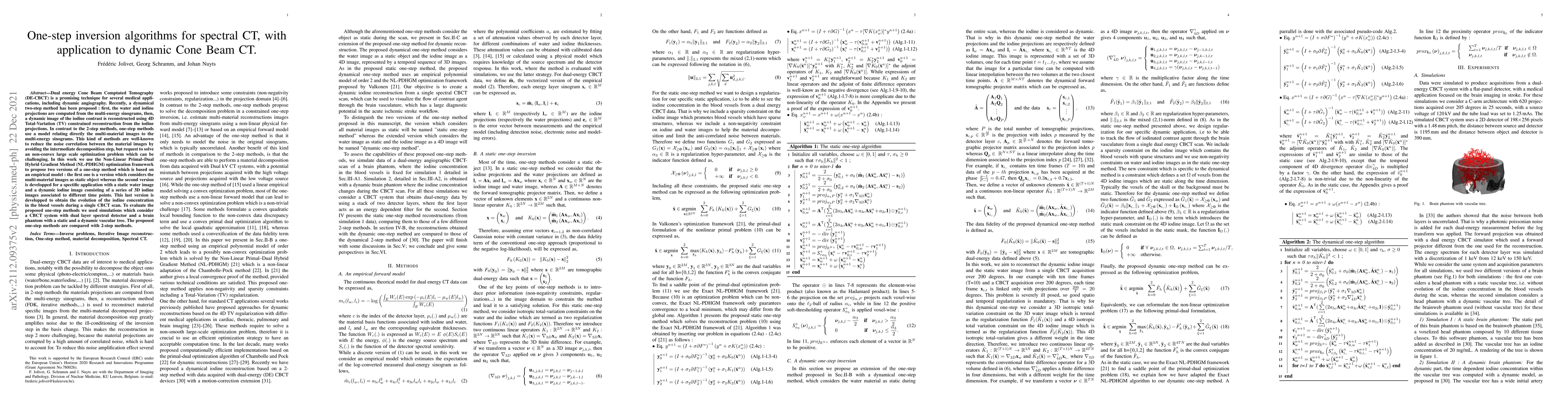 This paper proposes one-step inversion algorithms for spectral CT, particularly for dynamic Cone Beam Computed Tomography (CBCT), using the Non-Linear Primal-Dual Hybrid Gradient Method (NL-PDHGM). The one-step methods aim to directly relate multi-material images to multi-energy sinograms, reducing noise correlation compared to the conventional two-step method.