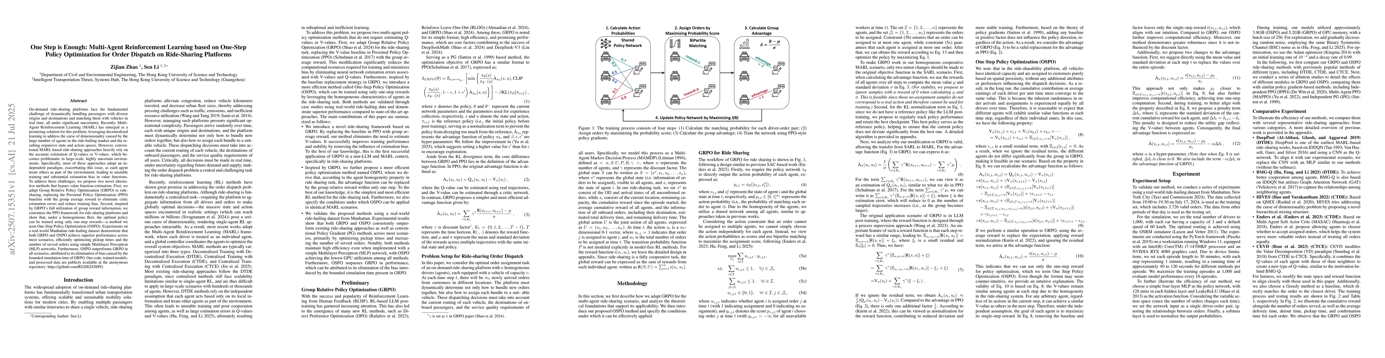 On-demand ride-sharing platforms face the fundamental challenge of dynamically bundling passengers with diverse origins and destinations and matching them with vehicles in real time, all under significant uncertainty. Recently, MARL has emerged as a promising solution for this problem, leveraging decentralized learning to address the curse of dimensionality caused by the large number of agents in the ride-hailing market and the resulting expansive state and action spaces. However, conventional MARL-based ride-sharing approaches heavily rely on the accurate estimation of Q-values or V-values, which becomes problematic in large-scale, highly uncertain environments. Specifically, most of these approaches adopt an independent paradigm, exacerbating this issue, as each agent treats others as part of the environment, leading to unstable training and substantial estimation bias in value functions. To address these challenges, we propose two novel alternative methods that bypass value function estimation. First, we adapt GRPO to ride-sharing, replacing the PPO baseline with the group average reward to eliminate critic estimation errors and reduce training bias. Second, inspired by GRPO's full utilization of group reward information, we customize the PPO framework for ride-sharing platforms and show that, under a homogeneous fleet, the optimal policy can be trained using only one-step rewards - a method we term One-Step Policy Optimization (OSPO). Experiments on a real-world Manhattan ride-hailing dataset demonstrate that both GRPO and OSPO achieve superior performance across most scenarios, efficiently optimizing pickup times and the number of served orders using simple MLP networks.