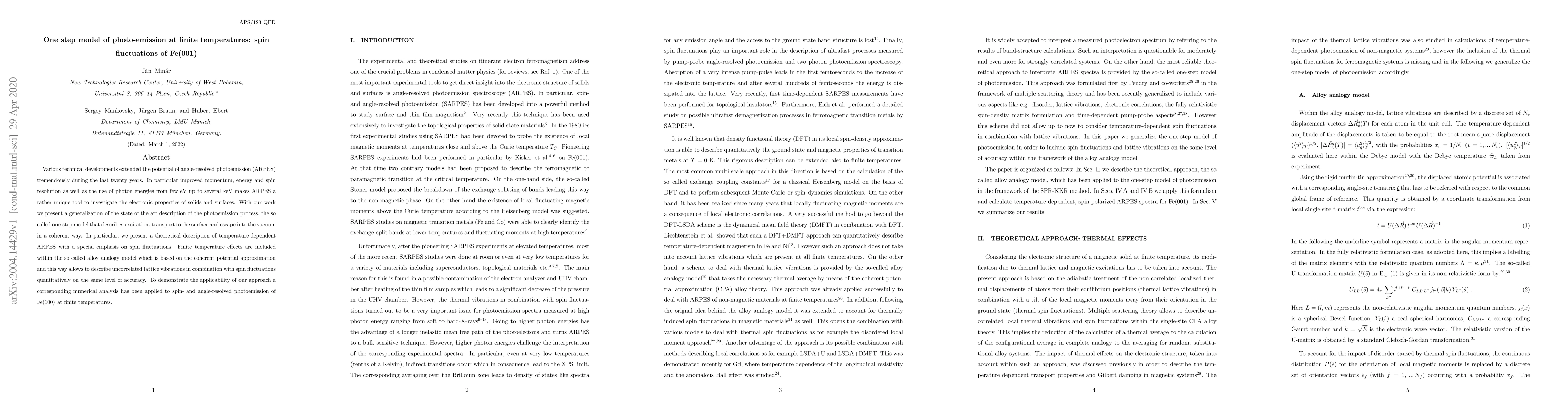 Various technical developments extended the potential of angle-resolved photoemission (ARPES) tremendously during the last twenty years. In particular improved momentum, energy and spin resolution as well as the use of photon energies from few eV up to several keV makes ARPES a rather unique tool to investigate the electronic properties of solids and surfaces. With our work we present a generalization of the state of the art description of the photoemission process, the so called one-step model that describes excitation, transport to the surface and escape into the vacuum in a coherent way. In particular, we present a theoretical description of temperature-dependent ARPES with a special emphasis on spin fluctuations. Finite temperature effects are included within the so called alloy analogy model which is based on the coherent potential approximation and this way allows to describe uncorrelated lattice vibrations in combination with spin fluctuations quantitatively on the same level of accuracy. To demonstrate the applicability of our approach a corresponding numerical analysis has been applied to spin- and angle-resolved photoemission of Fe(100) at finite temperatures.