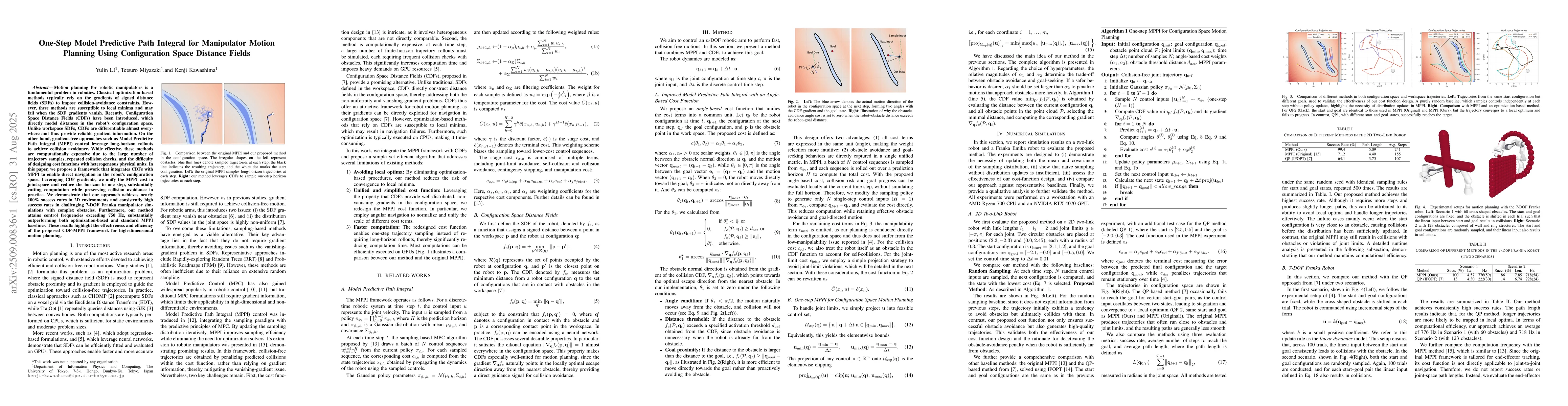 Motion planning for robotic manipulators is a fundamental problem in robotics. Classical optimization-based methods typically rely on the gradients of signed distance fields (SDFs) to impose collision-avoidance constraints. However, these methods are susceptible to local minima and may fail when the SDF gradients vanish. Recently, Configuration Space Distance Fields (CDFs) have been introduced, which directly model distances in the robot's configuration space. Unlike workspace SDFs, CDFs are differentiable almost everywhere and thus provide reliable gradient information. On the other hand, gradient-free approaches such as Model Predictive Path Integral (MPPI) control leverage long-horizon rollouts to achieve collision avoidance. While effective, these methods are computationally expensive due to the large number of trajectory samples, repeated collision checks, and the difficulty of designing cost functions with heterogeneous physical units. In this paper, we propose a framework that integrates CDFs with MPPI to enable direct navigation in the robot's configuration space. Leveraging CDF gradients, we unify the MPPI cost in joint-space and reduce the horizon to one step, substantially cutting computation while preserving collision avoidance in practice. We demonstrate that our approach achieves nearly 100% success rates in 2D environments and consistently high success rates in challenging 7-DOF Franka manipulator simulations with complex obstacles. Furthermore, our method attains control frequencies exceeding 750 Hz, substantially outperforming both optimization-based and standard MPPI baselines. These results highlight the effectiveness and efficiency of the proposed CDF-MPPI framework for high-dimensional motion planning.
