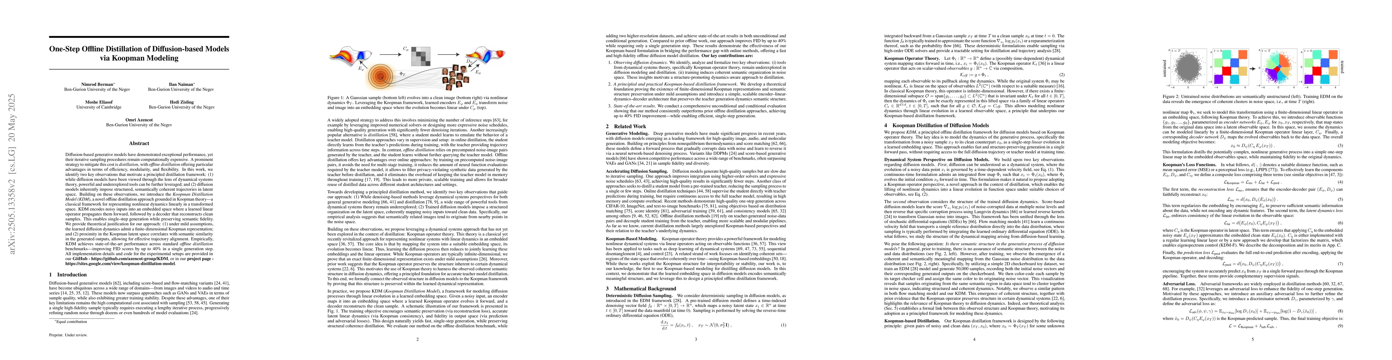 A new offline distillation approach called Koopman Distillation Model (KDM) is proposed to improve efficiency in diffusion-based generative models, achieving state-of-the-art performance with up to 40% improved FID scores.