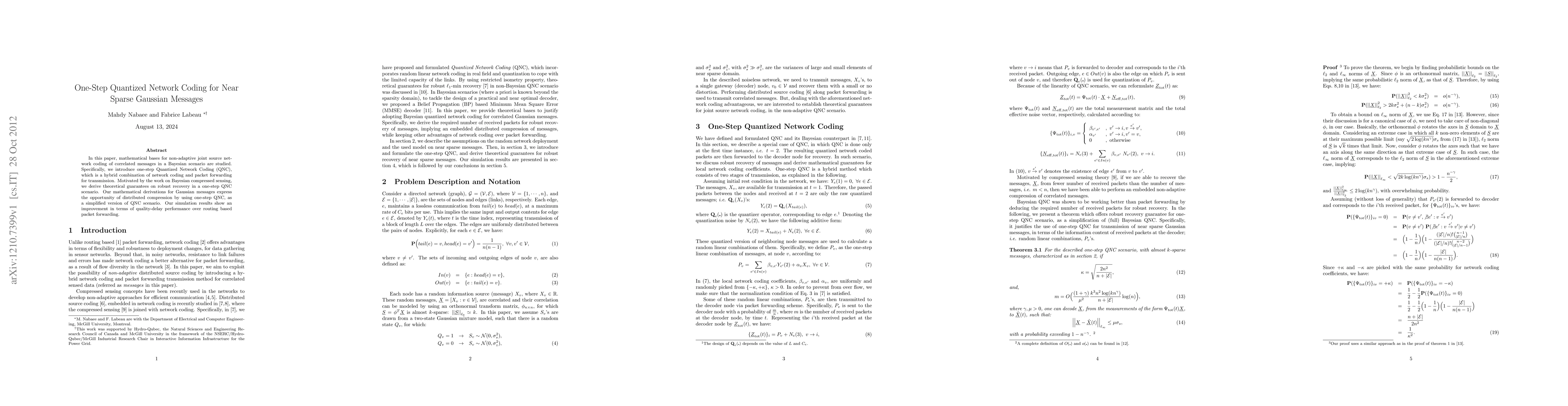 In this paper, mathematical bases for non-adaptive joint source network coding of correlated messages in a Bayesian scenario are studied. Specifically, we introduce one-step Quantized Network Coding (QNC), which is a hybrid combination of network coding and packet forwarding for transmission. Motivated by the work on Bayesian compressed sensing, we derive theoretical guarantees on robust recovery in a one-step QNC scenario. Our mathematical derivations for Gaussian messages express the opportunity of distributed compression by using one-step QNC, as a simplified version of QNC scenario. Our simulation results show an improvement in terms of quality-delay performance over routing based packet forwarding.