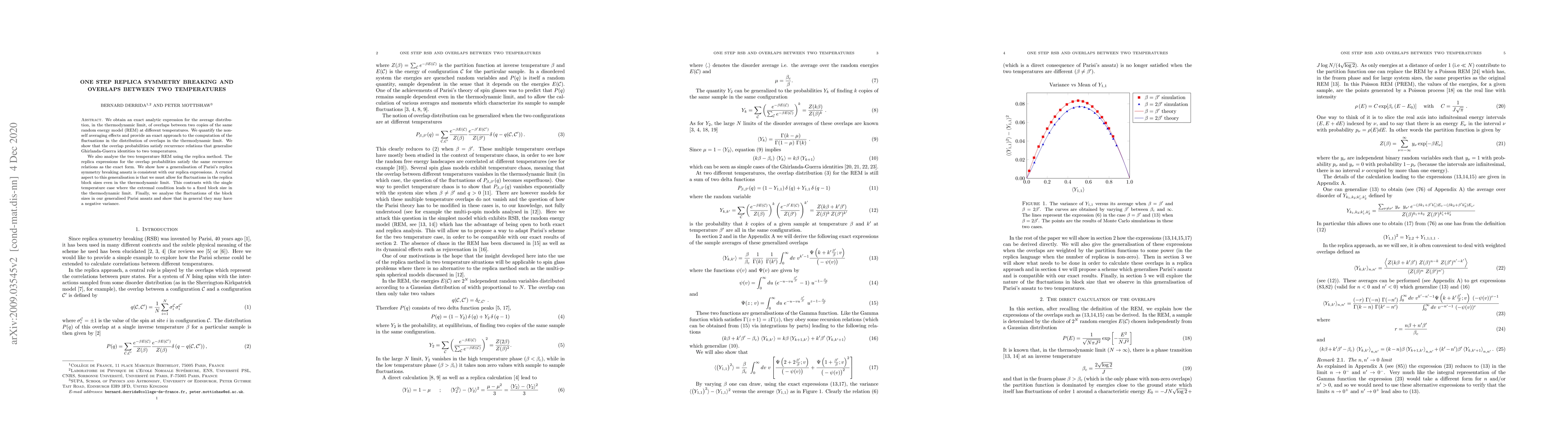 We obtain an exact analytic expression for the average distribution, in the thermodynamic limit, of overlaps between two copies of the same random energy model (REM) at different temperatures. We quantify the non-self averaging effects and provide an exact approach to the computation of the fluctuations in the distribution of overlaps in the thermodynamic limit. We show that the overlap probabilities satisfy recurrence relations that generalise Ghirlanda-Guerra identities to two temperatures. We also analyse the two temperature REM using the replica method. The replica expressions for the overlap probabilities satisfy the same recurrence relations as the exact form. We show how a generalisation of Parisi's replica symmetry breaking ansatz is consistent with our replica expressions. A crucial aspect to this generalisation is that we must allow for fluctuations in the replica block sizes even in the thermodynamic limit. This contrasts with the single temperature case where the extremal condition leads to a fixed block size in the thermodynamic limit. Finally, we analyse the fluctuations of the block sizes in our generalised Parisi ansatz and show that in general they may have a negative variance.