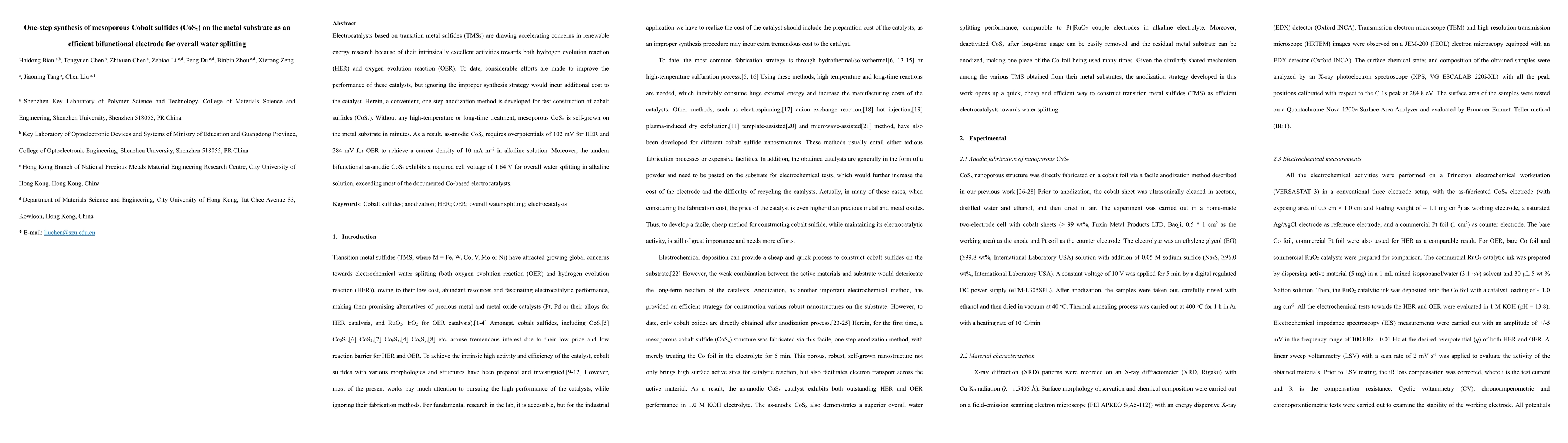 This paper presents a one-step anodization method to synthesize mesoporous cobalt sulfides (CoSx) on metal substrates, achieving efficient bifunctional electrocatalysis for hydrogen and oxygen evolution reactions. The method avoids high-temperature treatments, resulting in a cost-effective catalyst with low overpotentials and a cell voltage of 1.64 V for overall water splitting.