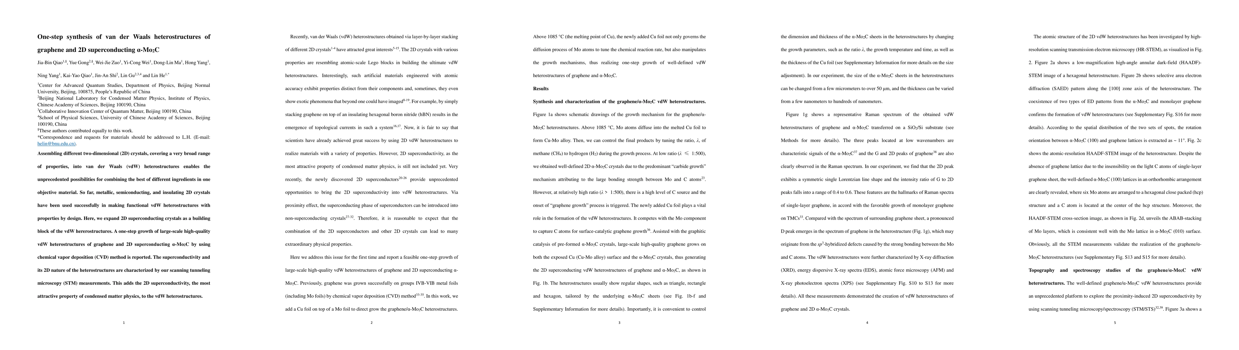 Assembling different two-dimensional (2D) crystals, covering a very broad range of properties, into van der Waals (vdW) heterostructures enables the unprecedented possibilities for combining the best of different ingredients in one objective material. So far, metallic, semiconducting, and insulating 2D crystals have been used successfully in making functional vdW heterostructures with properties by design. Here, we expand 2D superconducting crystals as a building block of the vdW hererostructures. A one-step growth of large-scale high-quality vdW heterostructures of graphene and 2D superconducting a-Mo2C by using chemical vapor deposition (CVD) method is reported. The superconductivity and its 2D nature of the heterostructures are characterized by our scanning tunneling microscopy (STM) measurements. This adds the 2D superconductivity, the most attractive property of condensed matter physics, to the vdW heterostructures.