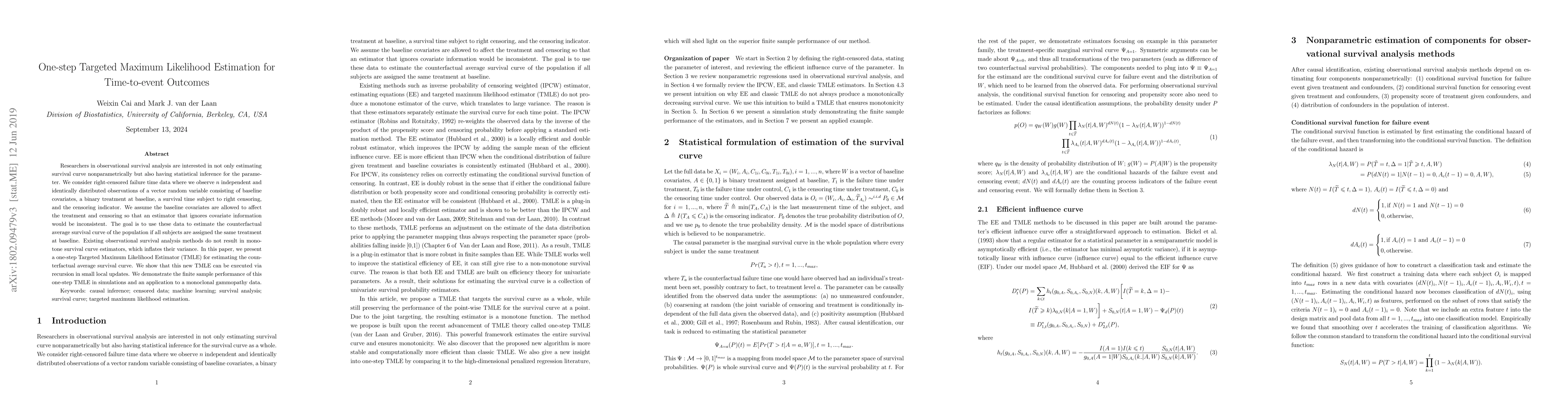 Current Targeted Maximum Likelihood Estimation (TMLE) methods used to analyze time-to-event data estimate the survival probability for each time point separately, which result in estimates that are not necessarily monotone. In this paper, we present an extension of TMLE for observational time-to-event data, the one-step Targeted Maximum Likelihood Estimator for the treatment-rule specific survival curve. We construct a one-dimensional universal least favorable submodel that targets the entire survival curve, and thereby requires minimal extra fitting with data to achieve its goal of solving the efficient influence curve equation. Through the use of a simulation study, we will show that this method improves on previously proposed methods in both robustness and efficiency, and at the same time respects the monotone decreasing nature of the survival curve.