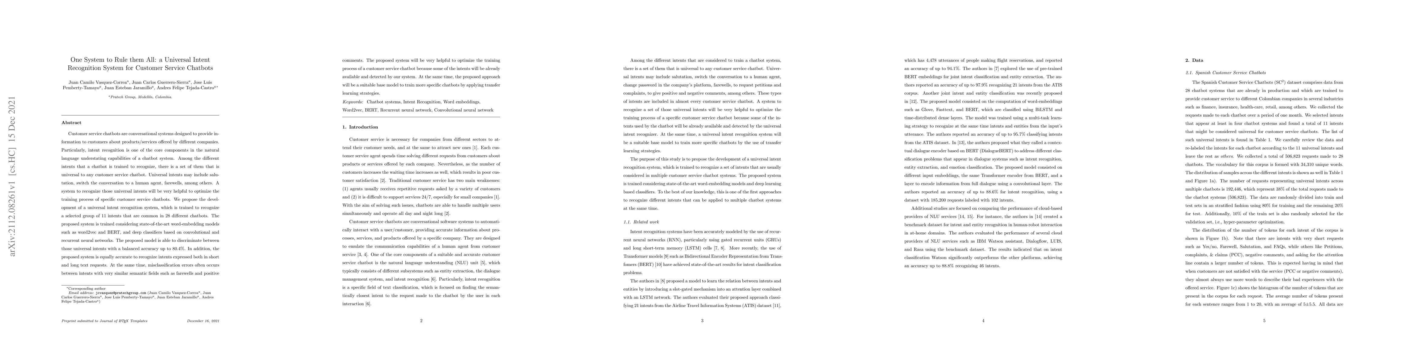 This paper proposes a universal intent recognition system for customer service chatbots, trained to identify 11 common intents across 28 different chatbots using advanced word-embedding and deep learning models. The system achieves a balanced accuracy of 80.4% and can handle both short and long text requests, though misclassifications occur between semantically similar intents.