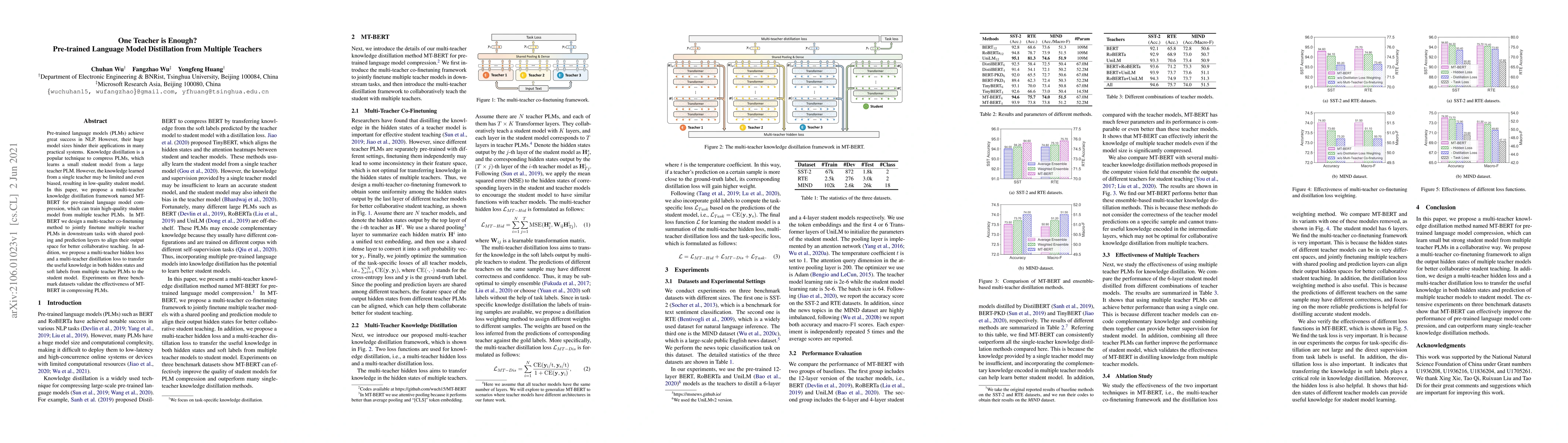 This paper proposes MT-BERT, a multi-teacher knowledge distillation framework for compressing large pre-trained language models (PLMs). It employs a co-finetuning method and introduces multi-teacher losses to effectively transfer knowledge from multiple teacher models, leading to higher-quality student models, validated through experiments on three datasets.