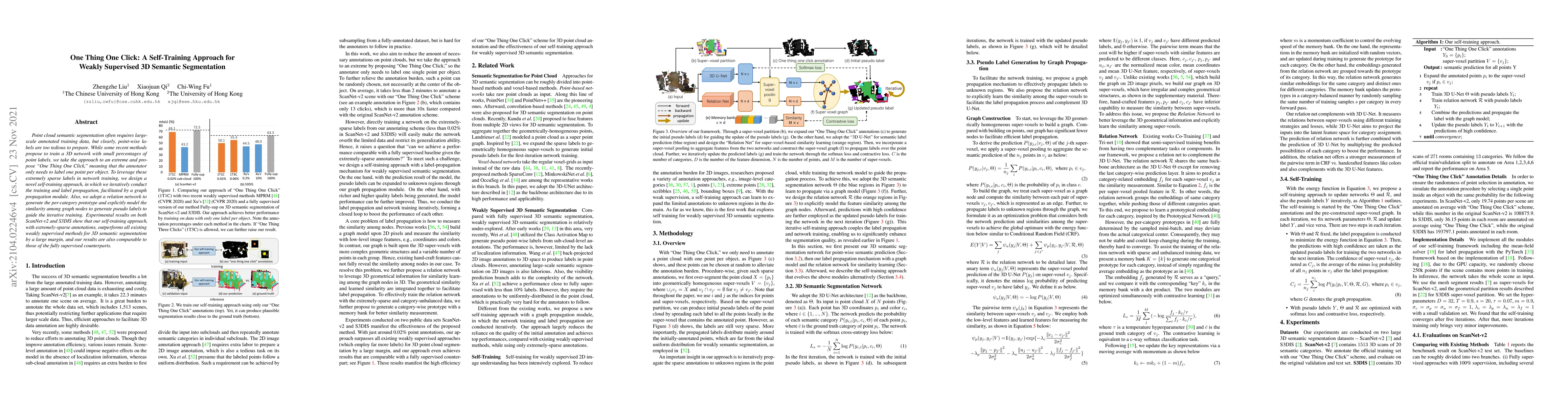 This paper proposes "One Thing One Click," a self-training method for weakly supervised 3D semantic segmentation that requires minimal annotations—just one point per object. It leverages a graph propagation module and a relation network to iteratively generate pseudo labels, significantly outperforming existing weakly supervised methods and achieving results comparable to fully supervised approaches.