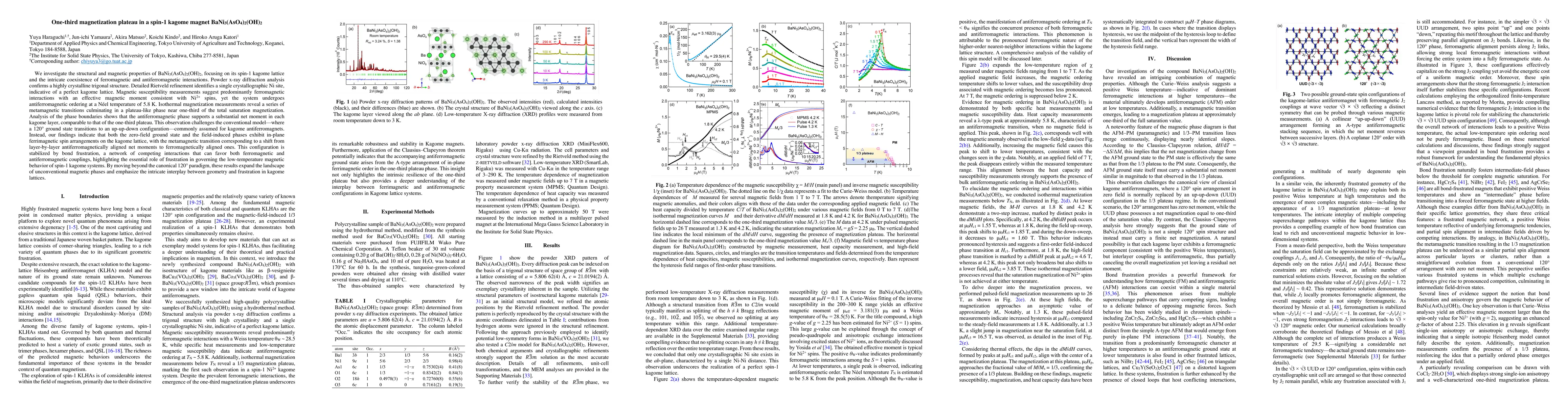The paper presents a detailed analysis of the structural and magnetic properties of BaNi$_3$(AsO$_4$)$_2$(OH)$_2$, revealing a one-third magnetization plateau and in-plane ferrimagnetic spin arrangements on the kagome lattice.